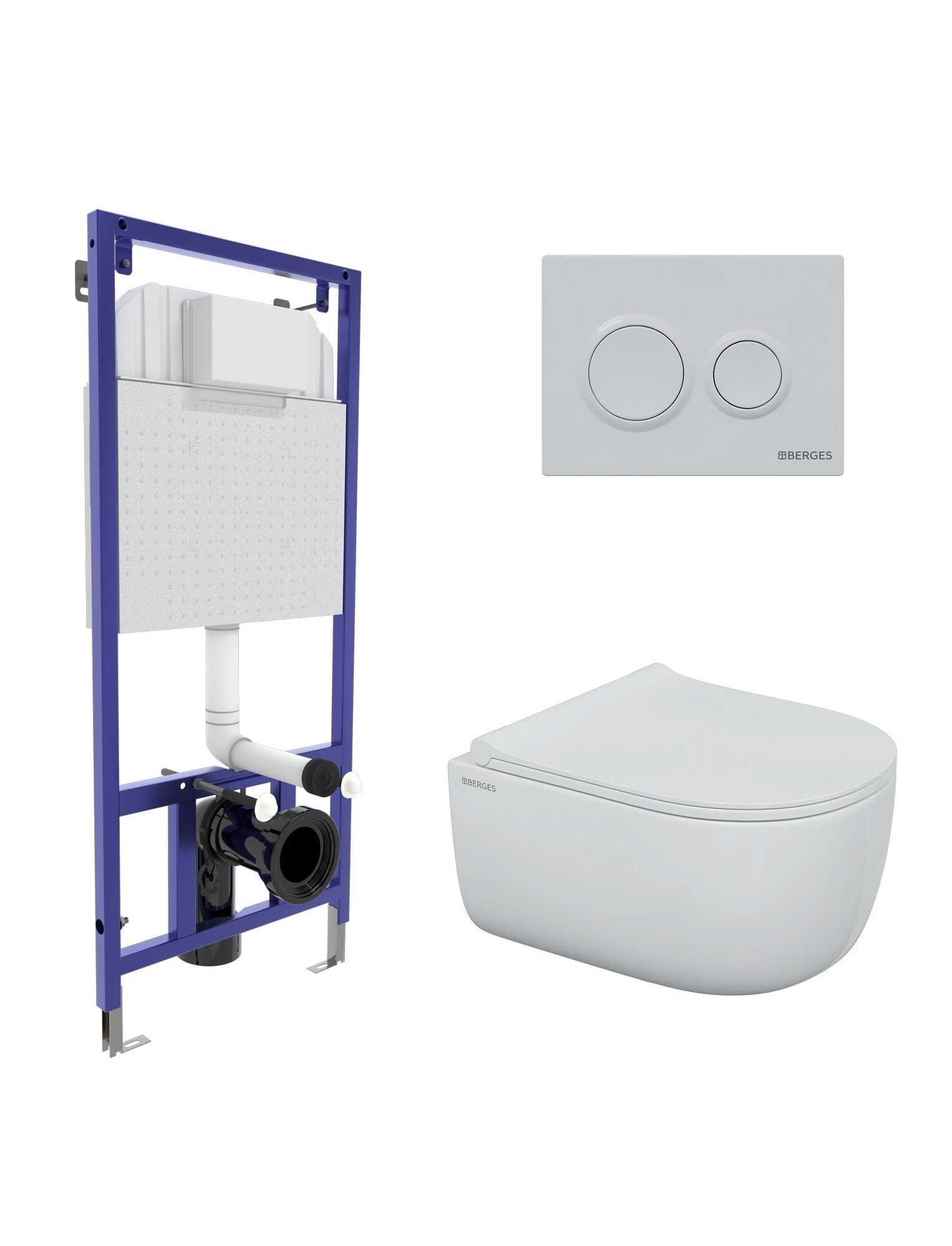 Комплект BERGES для монтажа подвесного унитаза: инсталляция NOVUM525, кнопка O1 белая, унитаз EGO Rimless, сиденье дюропласт Okus Slim SO, микролифт, быстросъем