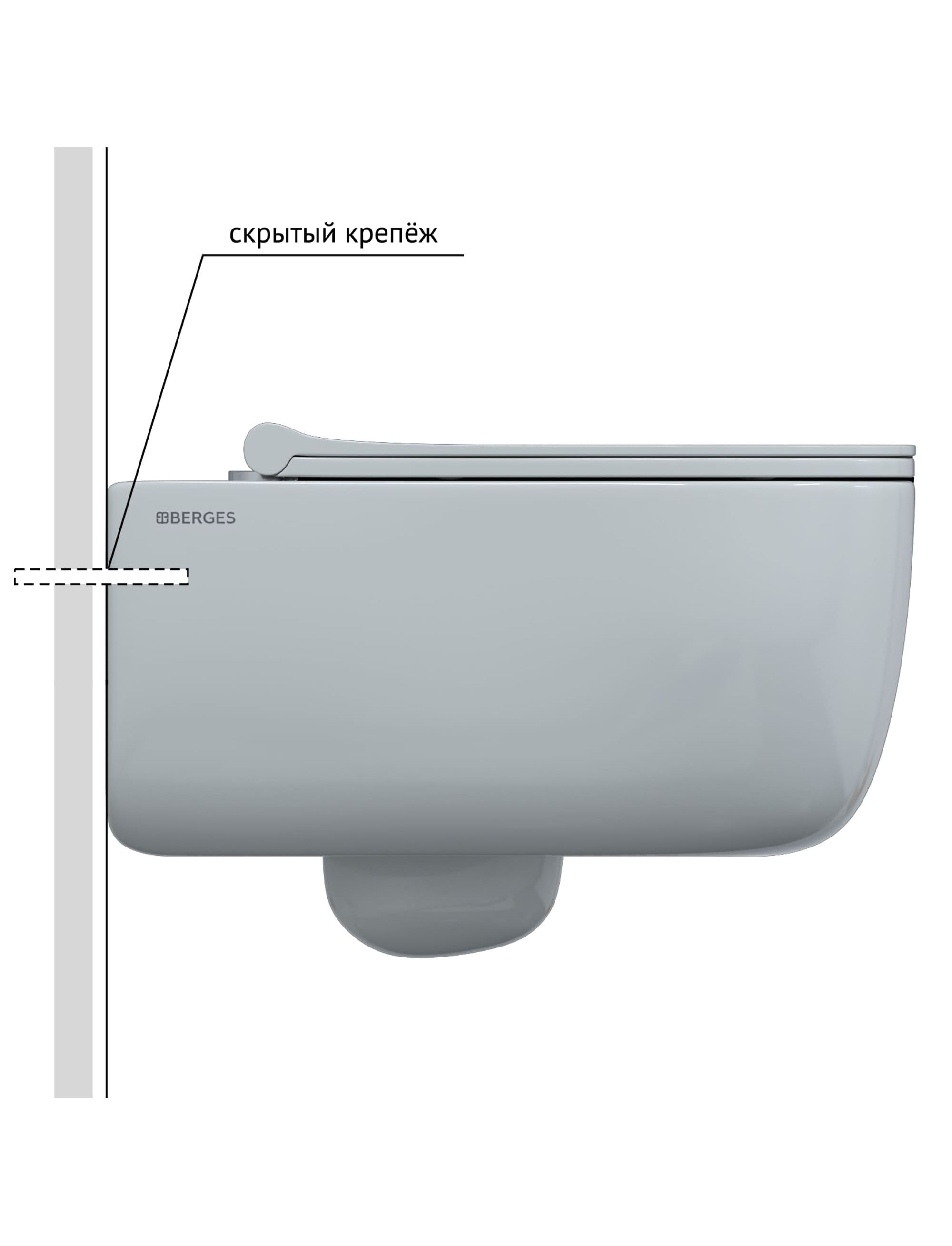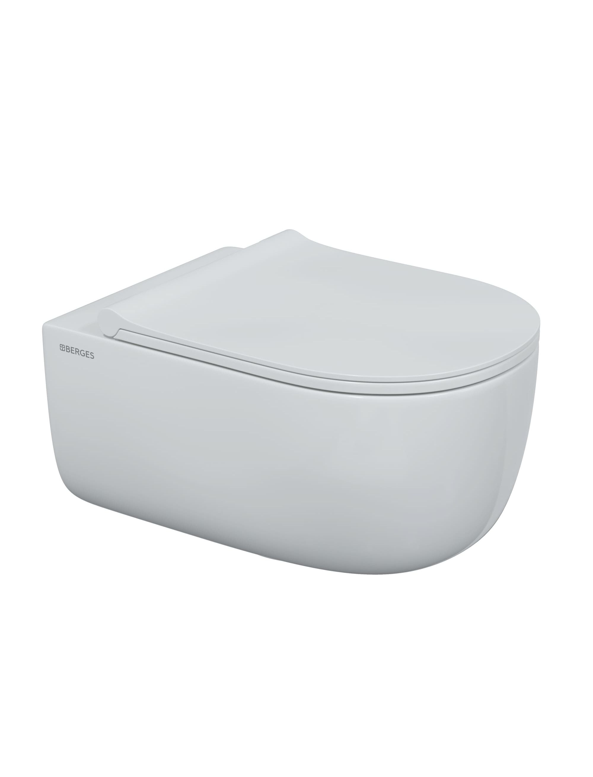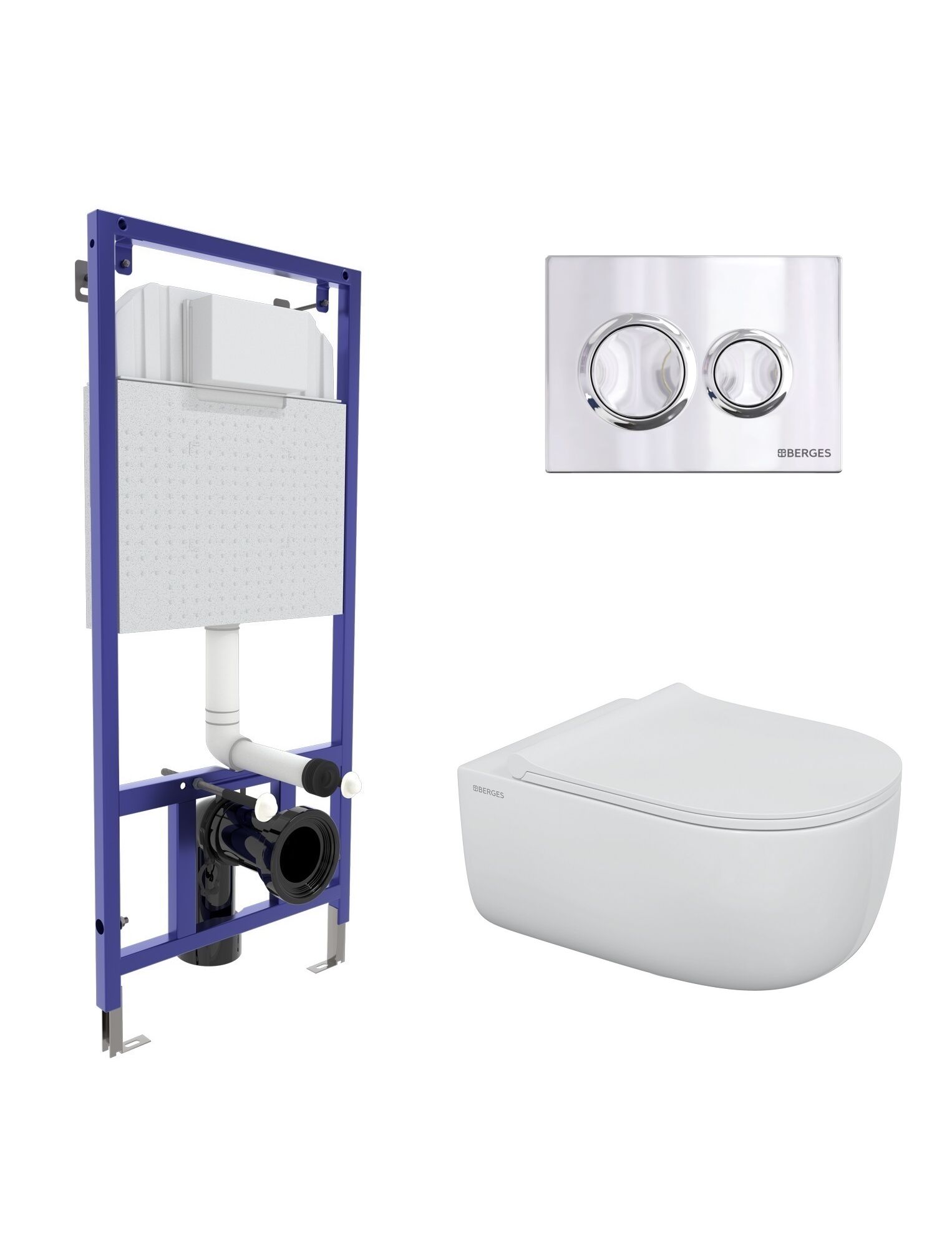Комплект BERGES для монтажа подвесного унитаза: инсталляция NOVUM525, кнопка O3 хром глянец, унитаз EGO XL Rimless, сиденье дюропласт Okus Slim SO, микролифт, быстросъем