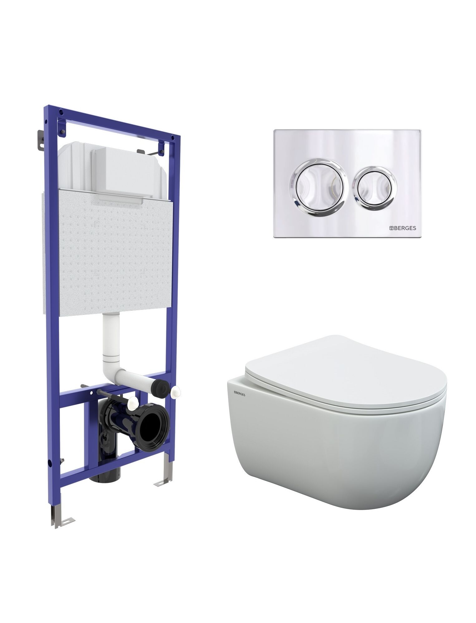 Полный Комплект BERGES для монтажа подвесного унитаза: инсталляция NOVUM525: толщина бачка 80 мм, резервуар воды объемом 10 литров с тепло-шумоизоляцией, объем смыва 3/6 литра с возможностью регулировки, нагрузка 400 кг, антикоррозийное покрытие, кнопка О3 хром глянец, ABS-пластик, унитаз VENTAS: Безободковый смыв, сиденье дюропласт Ventas Slim SO: микролифт, быстросъемное. Все крепежи для установки в комплекте. Возможность установки в угол. Гарантия 10 лет.