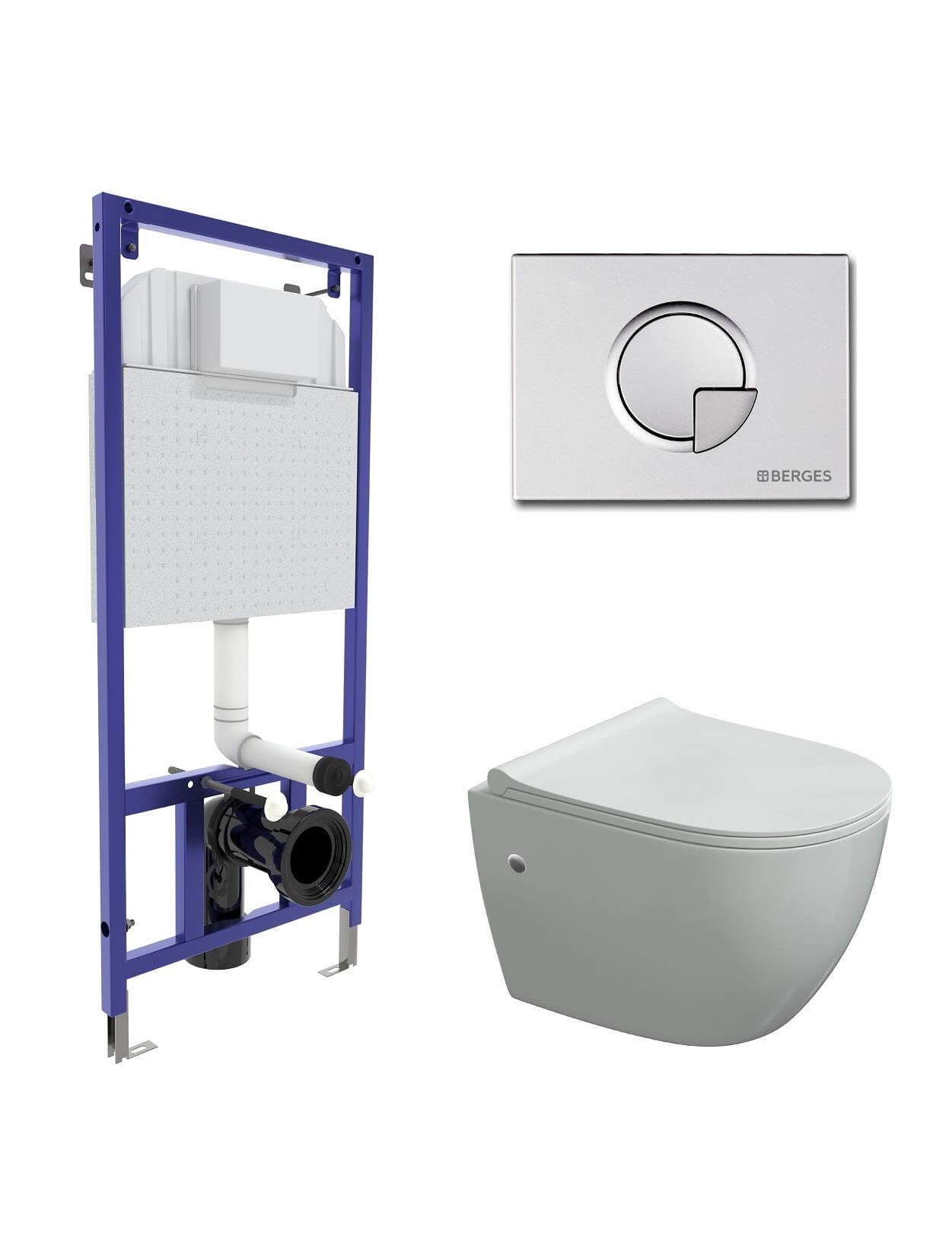 Комплект BERGES для монтажа подвесного унитаза: инсталляция NOVUM525, кнопка R2 матовый хром, унитаз OKUS, сиденье дюропласт Toma Slim SO