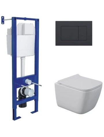 Комплект BERGES: инсталляция АТОМ кнопка черная SoftTouch, унитаз QUATTRO S Rimless 49 см, сидение дюропласт микролифт, быстросъём
