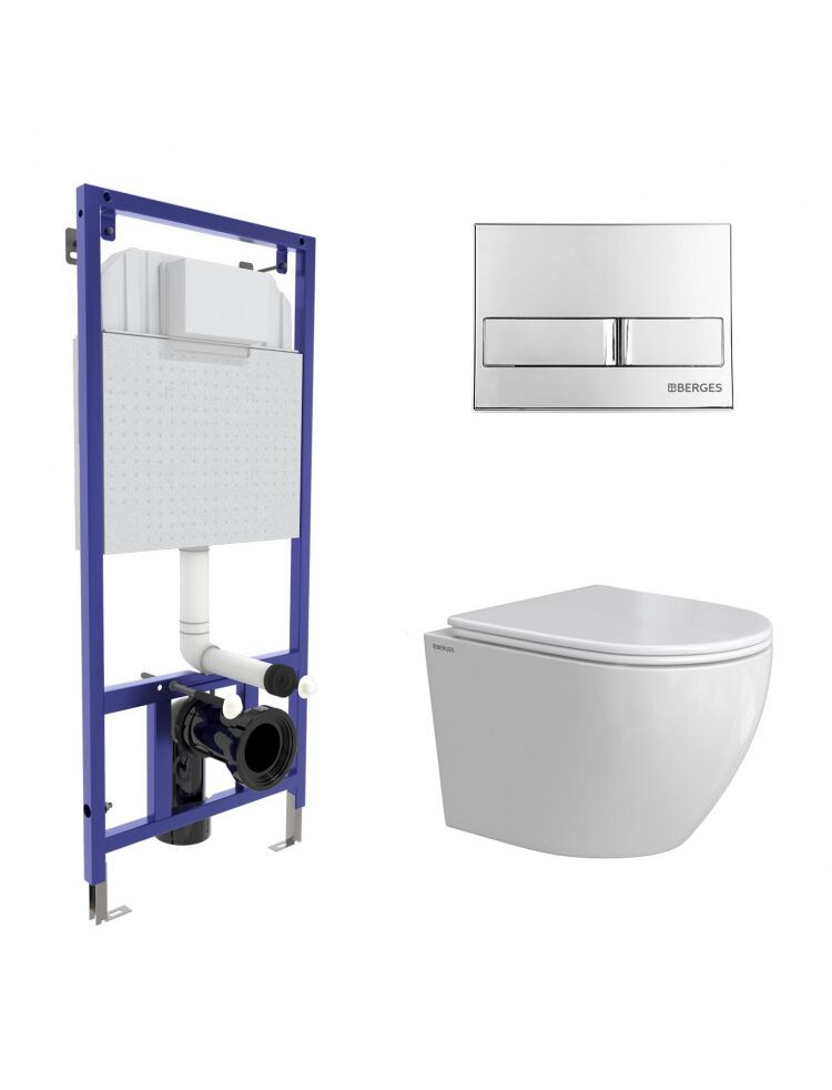Комплект BERGES: инсталляция NOVUM кнопка L3 хром глянец, унитаз OKUS Rimless 49 см, сиденье дюропласт микролифт, быстросъём