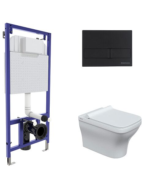 Комплект BERGES: инсталляция NOVUM кнопка L5 черная SoftTouch, унитаз Strati Rimless, сидение дюропласт Strati Slim SO