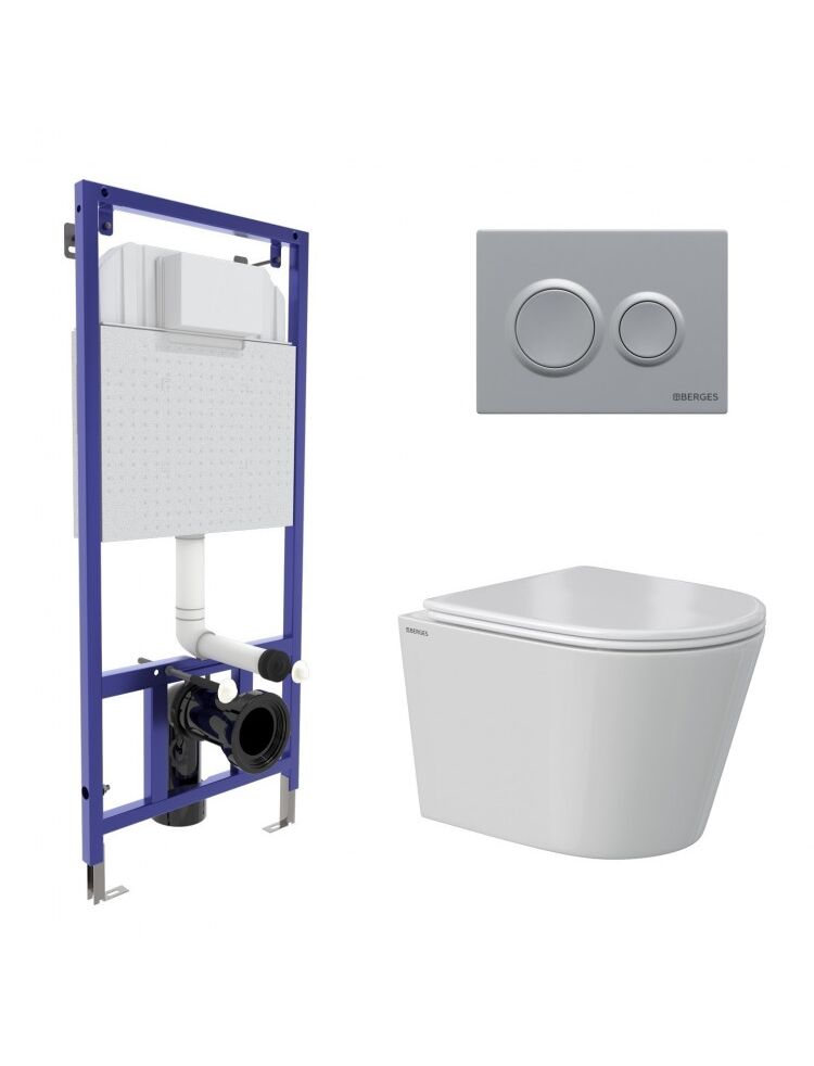 Комплект BERGES: инсталляция NOVUM кнопка O2 матовый хром, унитаз VITA Rimless 49 см, сиденье дюропласт микролифт, быстросъём
