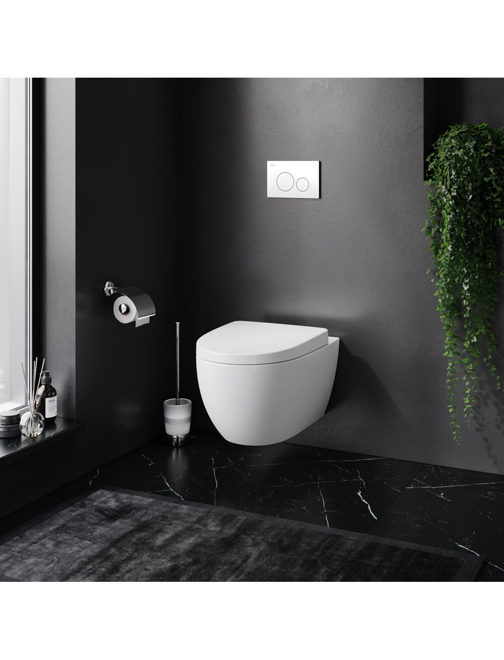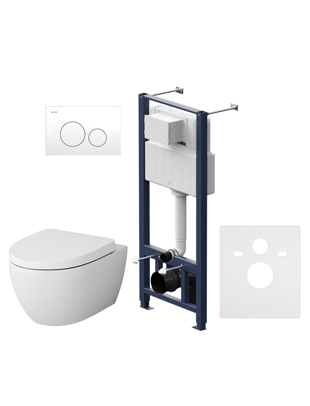 - Полностью готовый к установке комплект: система инсталляции с клавишей, подвесной унитаз сиденьем.