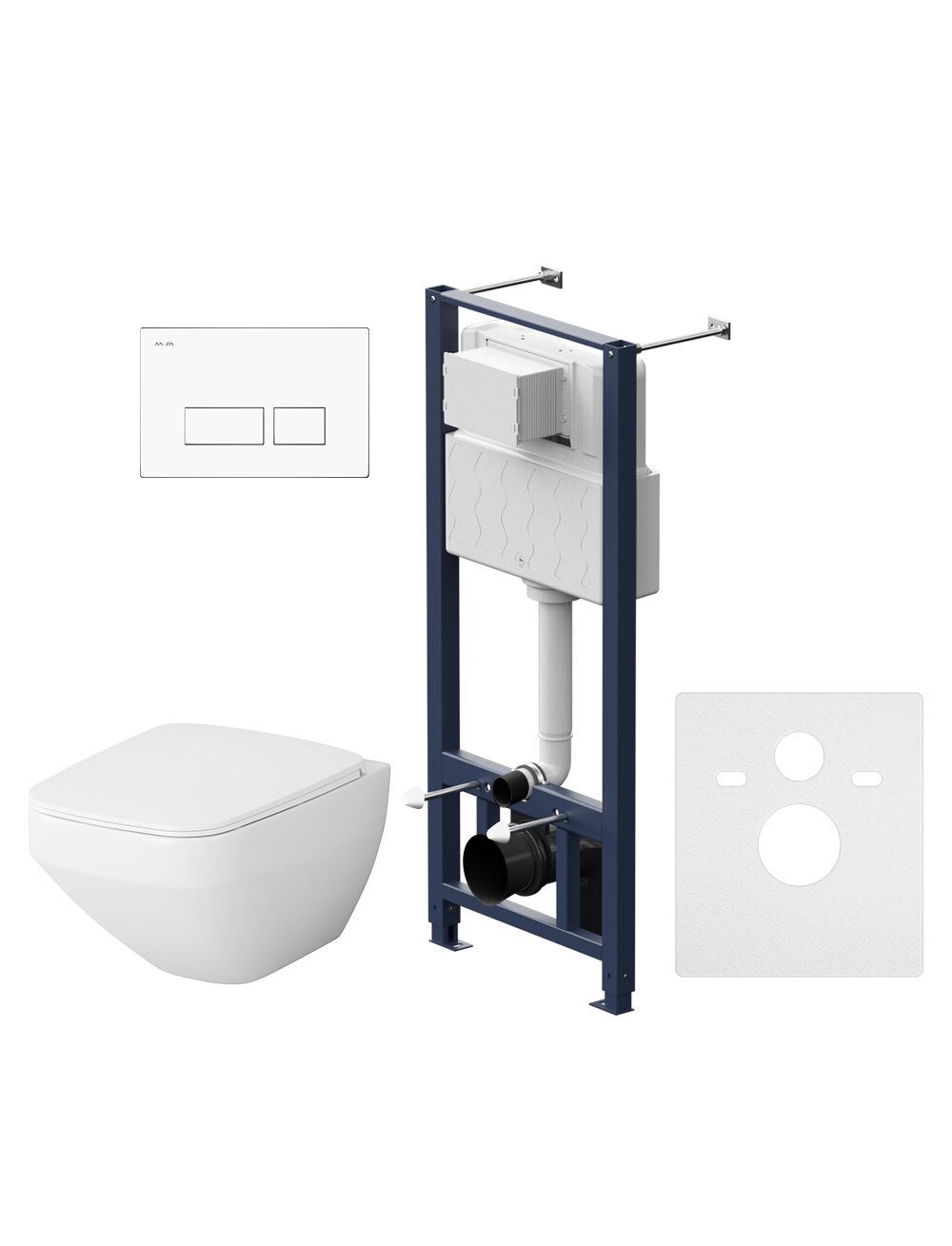 - Полностью готовый к установке комплект: система инсталляции с клавишей, подвесной унитаз сиденьем.