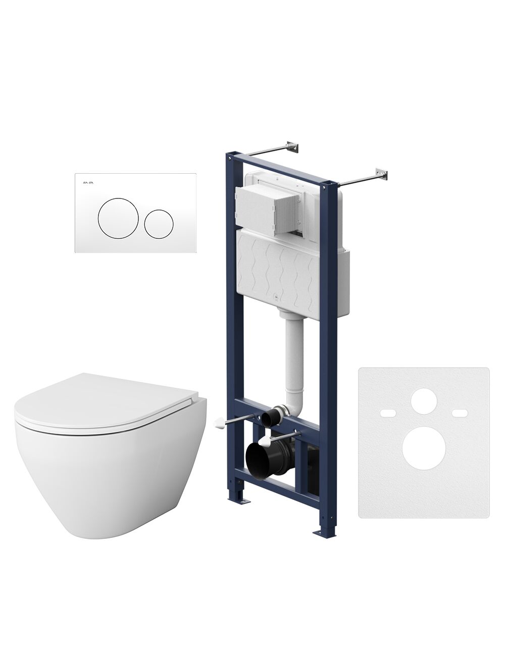 - Полностью готовый к установке комплект: система инсталляции с клавишей, подвесной унитаз сиденьем.