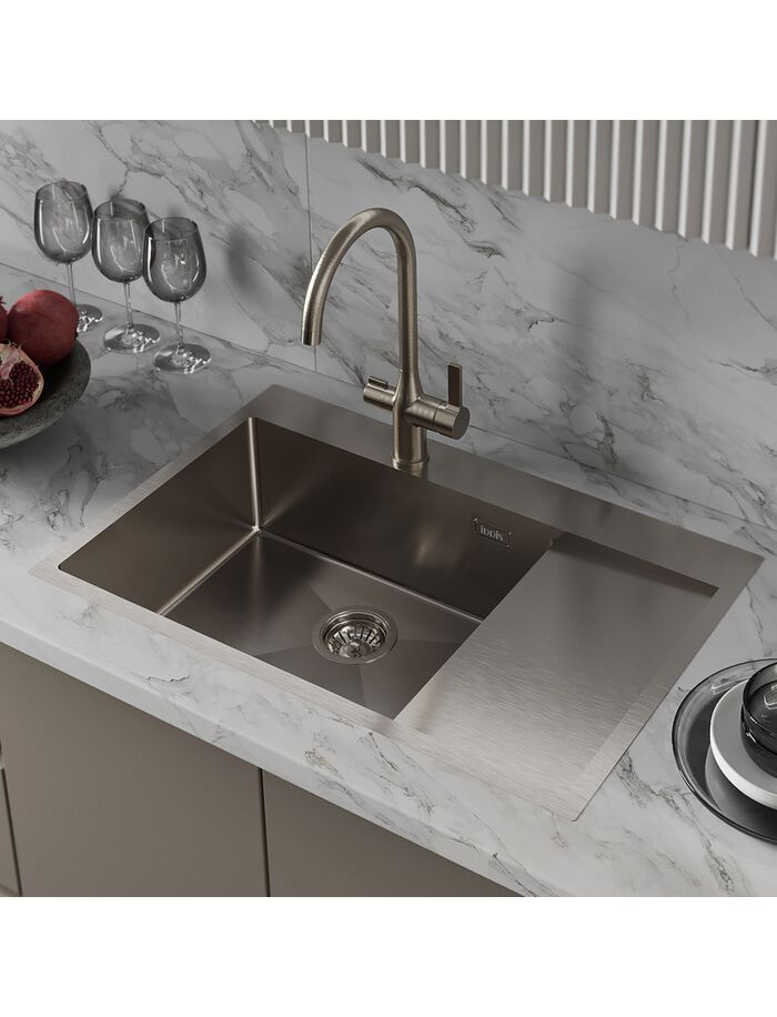 Мойка Haze отличается современным дизайном и ручным методом производства, что позволяет добиться идеальной геометрии – малый радиус скругления углов увеличивает рабочее пространство без «мертвых» зон. Удобно разместить много посуды и мыть крупные предметы. Подходит для шкафа от 55 см.