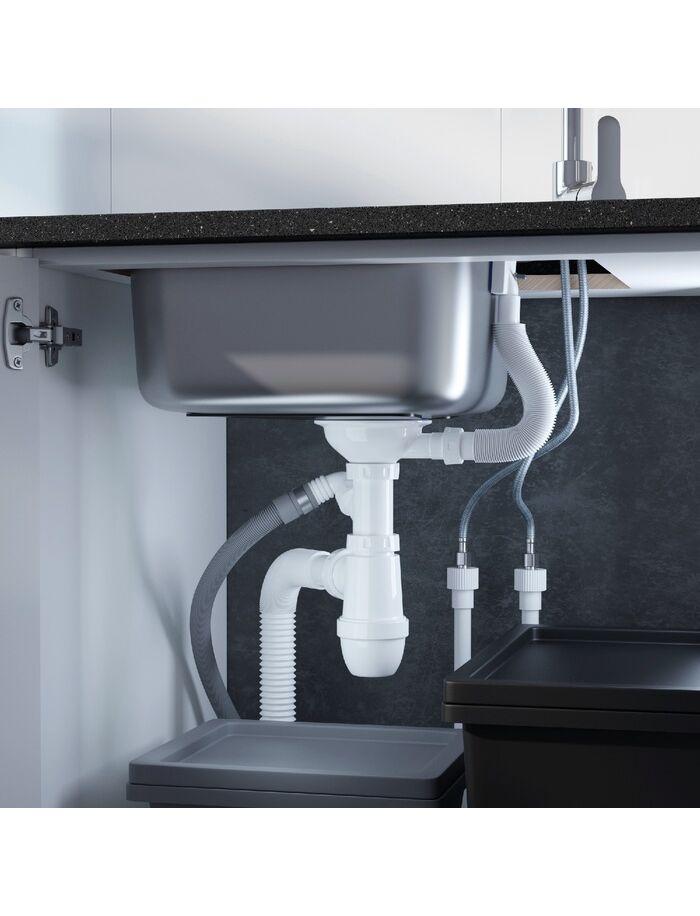• Сифон с отдельным отводом для стиральной/посудомоечной машины с обратным клапаном и гофрированными отводами для удобства подключения.