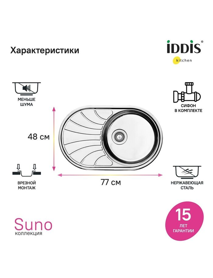 Мойка с сифоном арт. S11UPS0i84, нерж. сталь, шелк, 770*480, Suno S, IDDIS, SUN77SDi77S