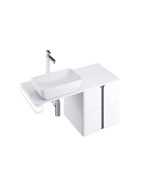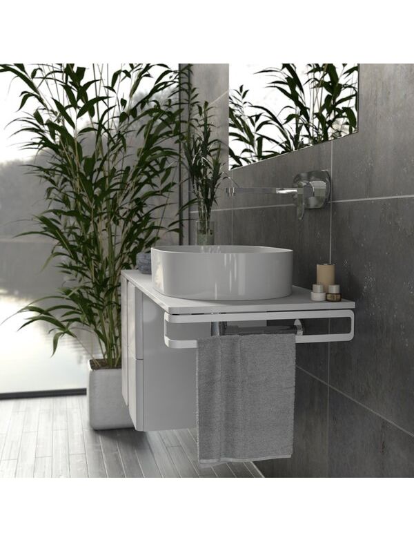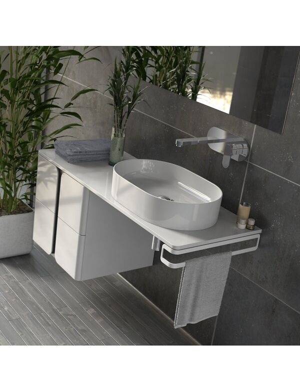 Если столешница устанавливается с одной подвесной тумбой, ее необходимо дополнительно укрепить с другой стороны с помощью кронштейна Balance / Comfort 1200. Под столешницей можно установить полотенцедержатель Balance белого цвета.