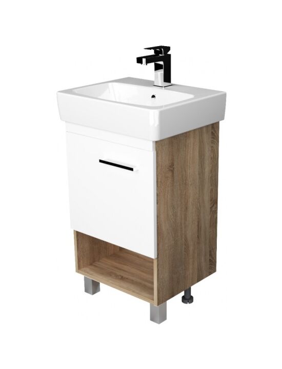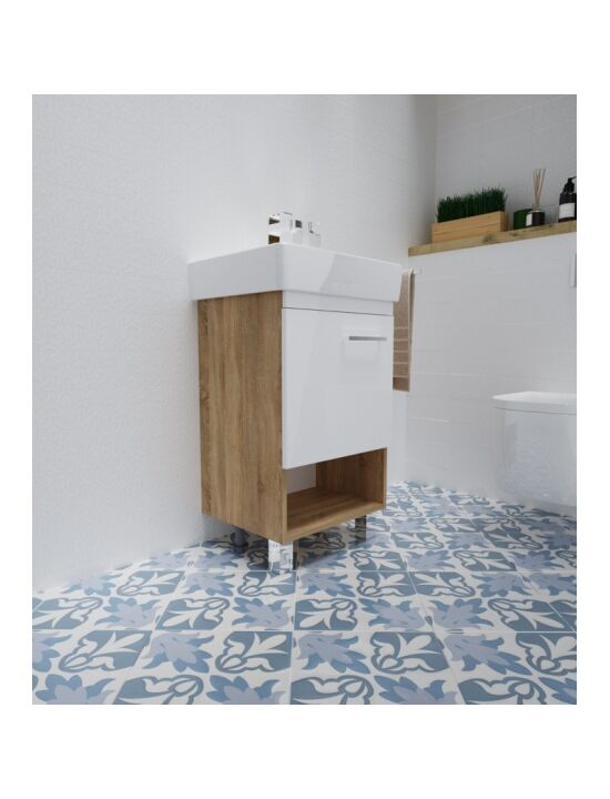Компактная мебель выполнена в современном минималистичном стиле, для которого характерны правильные геометрические формы, рациональность и эргономичность. Для бережливой повседневной эксплуатации, тумбы оснащены демпферами и дверными петлями с доводчиками, обеспечивающими бесшумное и мягкое закрывание.