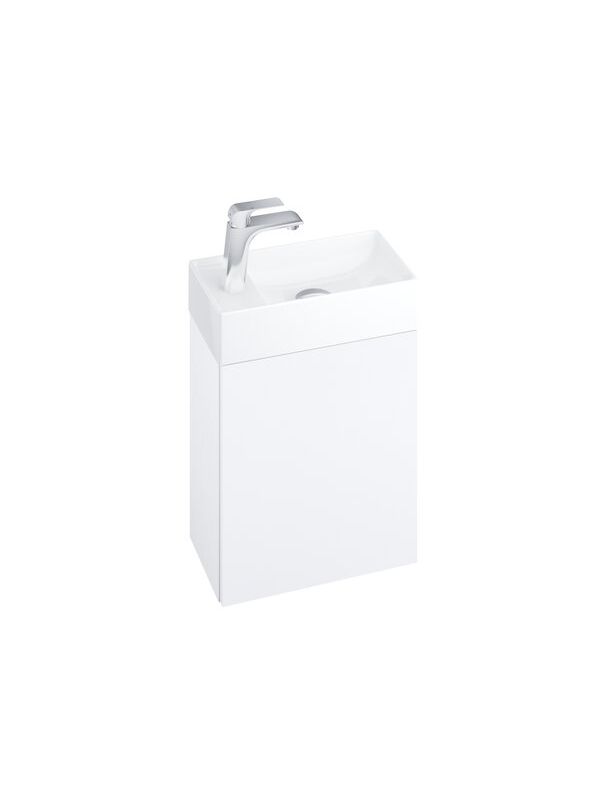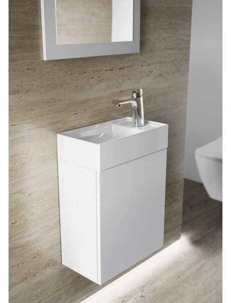 Керамический умывальник Veda и одноименная тумба белого цвета создают практичное компактное место для поддержания гигиены рук в туалетной комнате и ультрамалых ванных комнатах. Внутри тумбы можно скрыть, например, туалетные принадлежности.