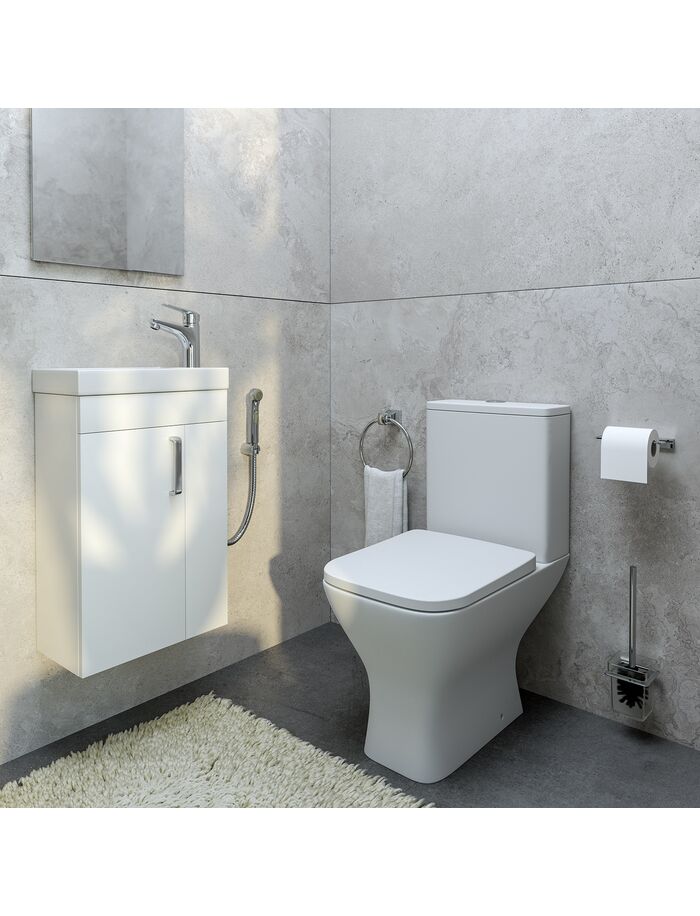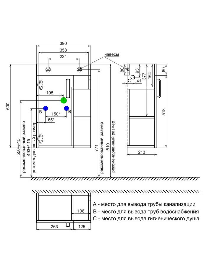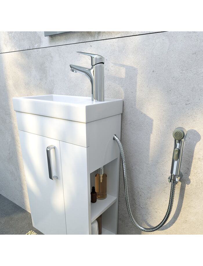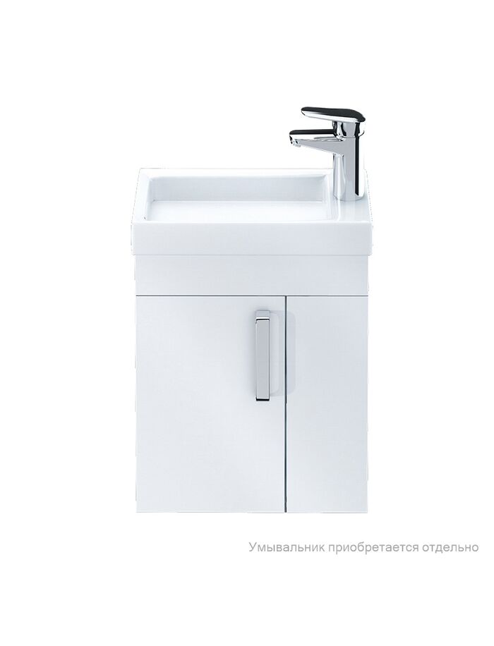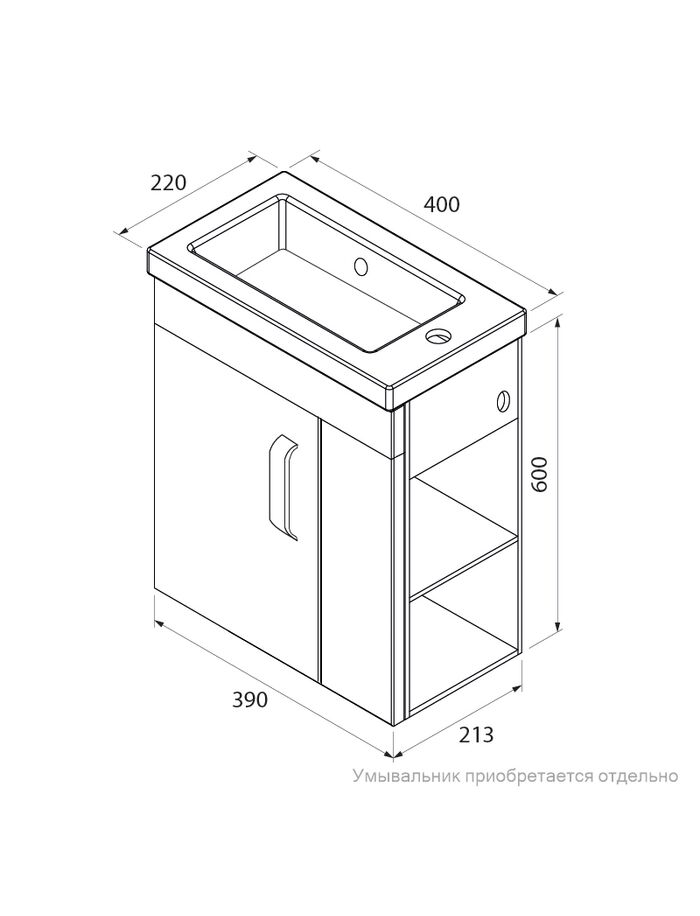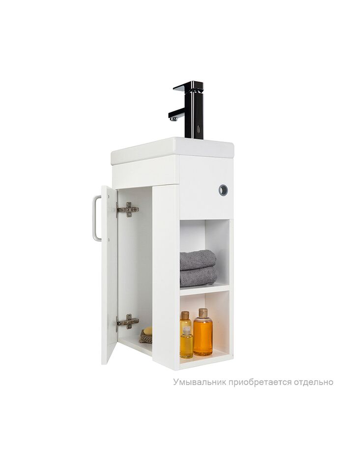 Тумба для ванной комнаты, подвесная. Размеры: 213х390х600 мм (ДхШхВ). Фасад ЛДСП 16 мм в эмали, боковины ЛДСП белый глянец. Одна распашная дверца, фальш-фасад, 2 открытые полки с правой стороны. Сбоку тумбы - отверстие для гигиенического душа с пластиковым кольцом. Петли с доводчиком. Упаковка: картон, пленка, пенопластовые уголки. Подходит умывальник 0014000U28.