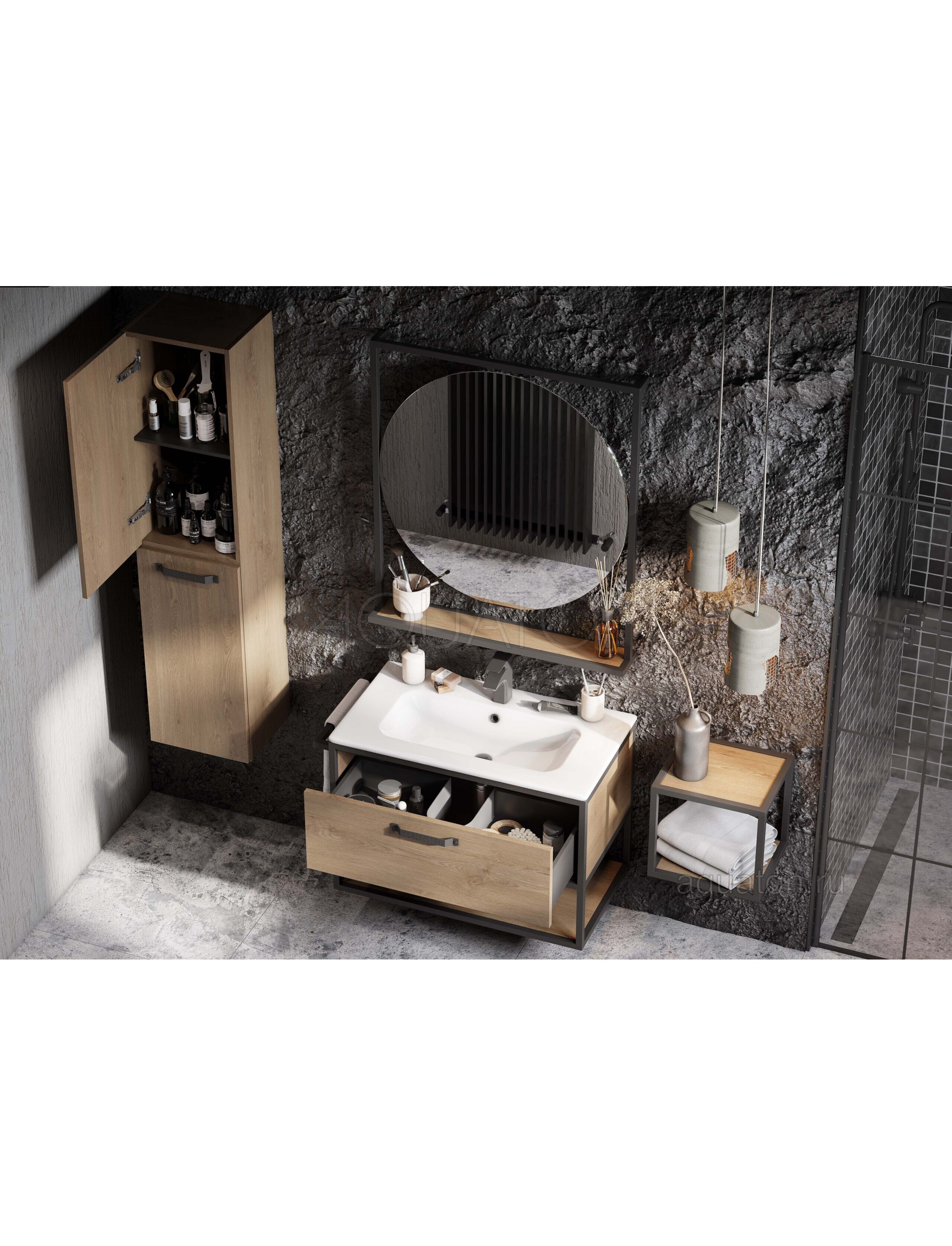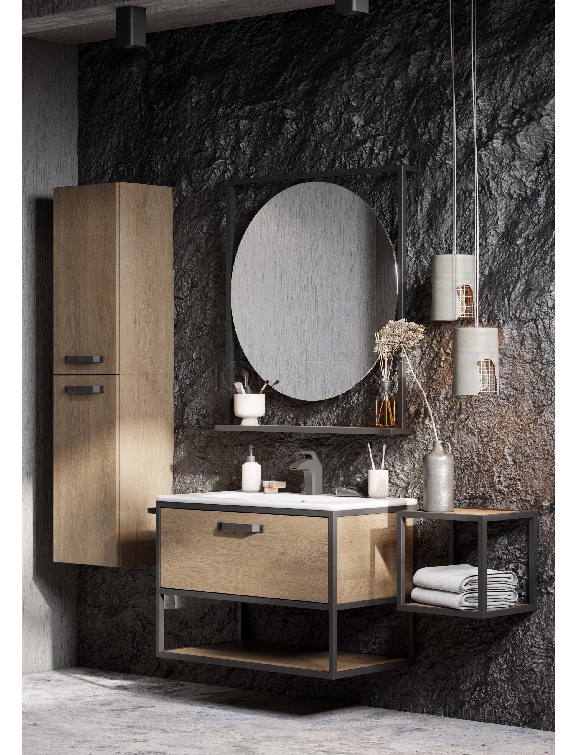 Зеркало Лофт Фабрик в размере 80 отличается необычным оригинальным дизайном и удобным функционалом. Черные металлические профили обрамляют круглое зеркало, под которым находится полочка из влагостойкой ламинированной плиты в цвете Дуб Кантри. Открытая полочка удобна для косметических и декоративных мелочей, которые всегда должны быть под рукой.