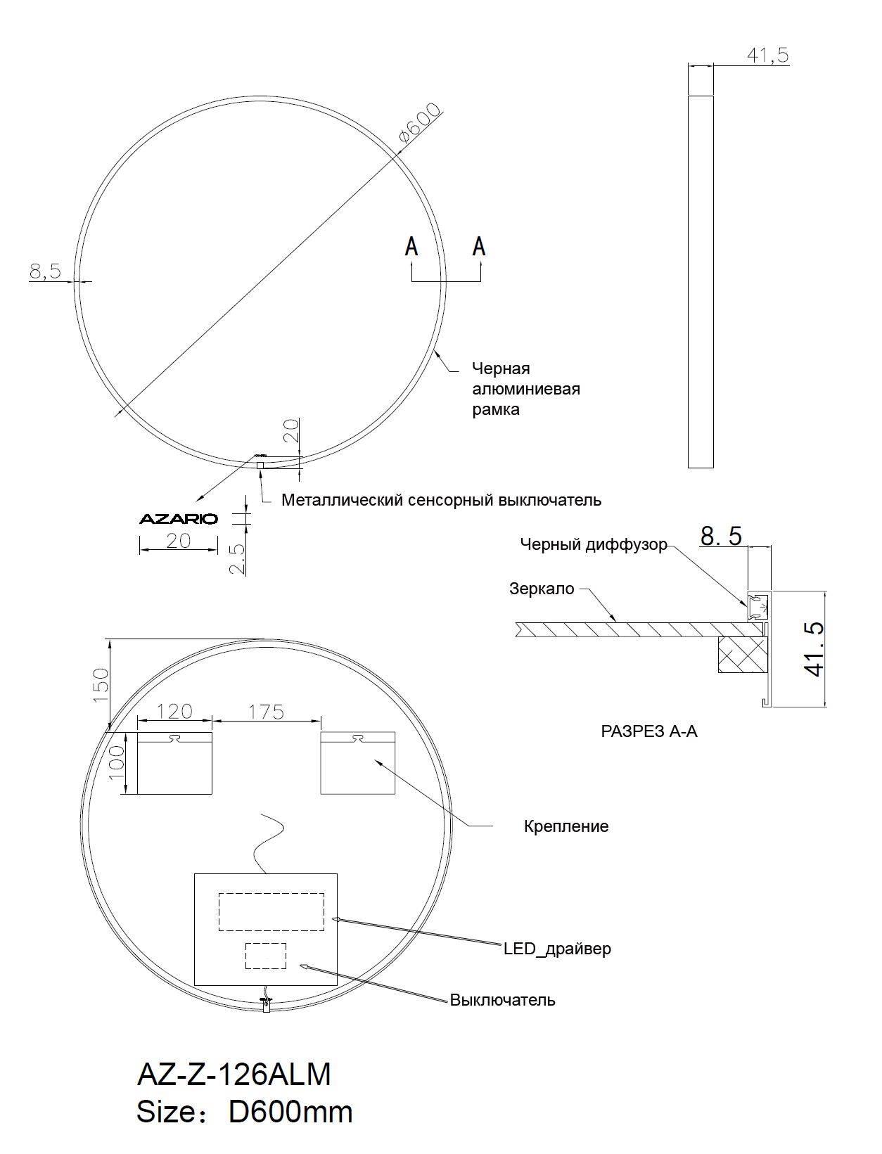 Зеркало для ванной Azario AZ-Z-126ALM D600
