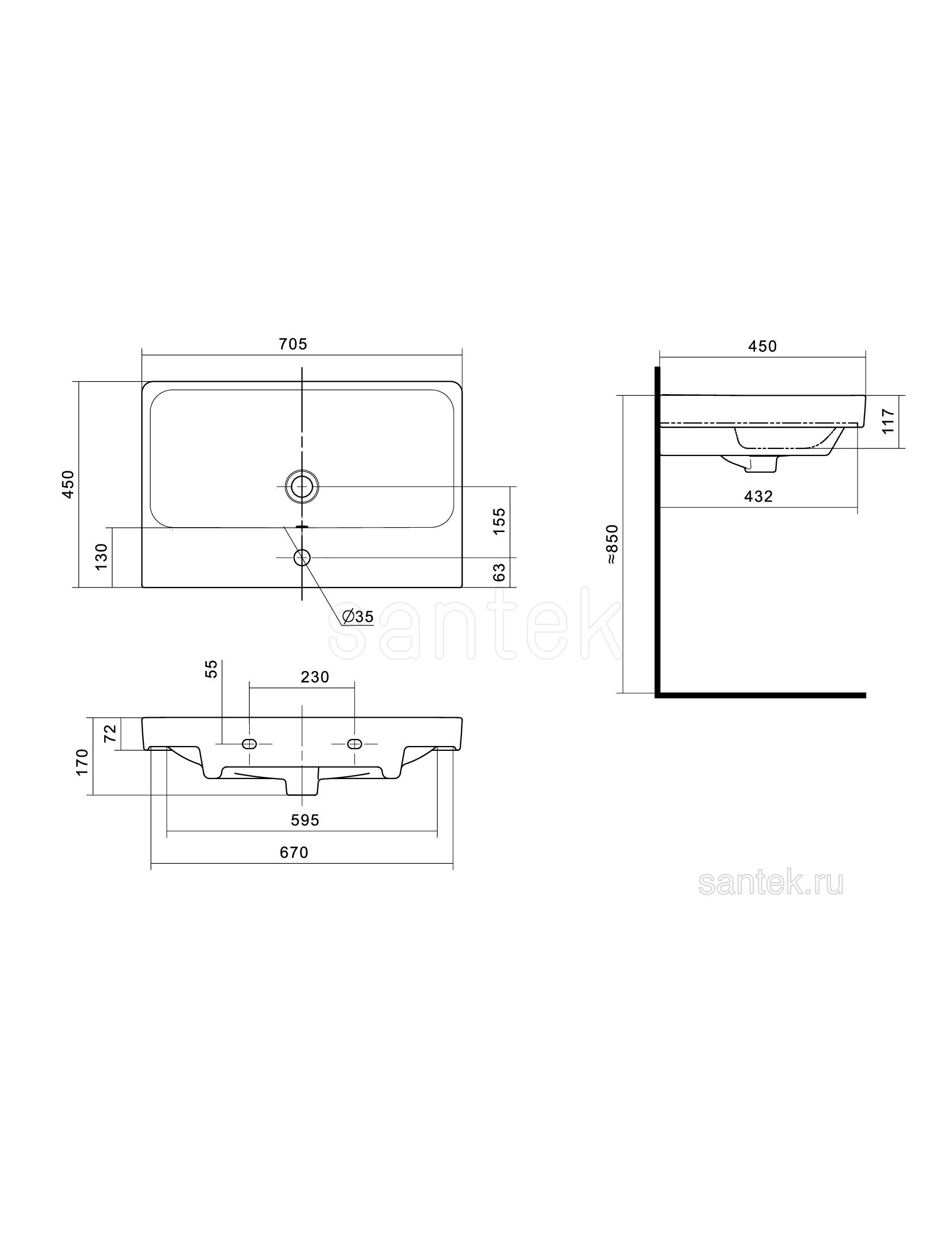 Раковина Santek Адриана 70 отверстие под смеситель 1WH501628