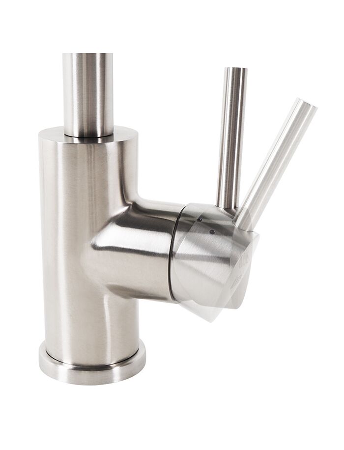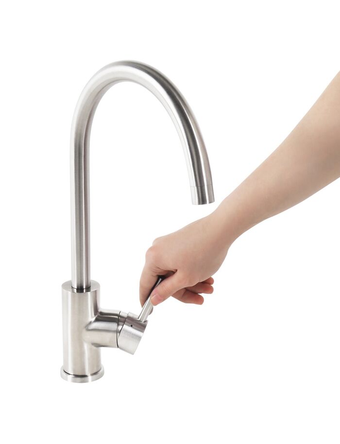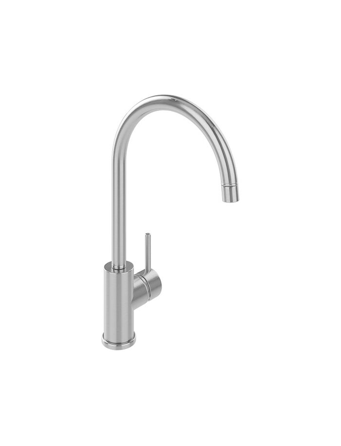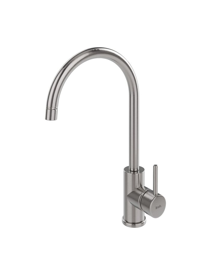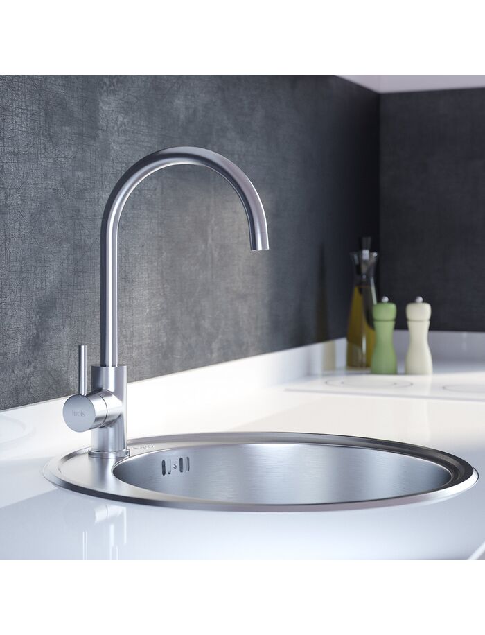 Смеситель для кухни из нержавеющей стали Kitchen универсального дизайна подойдет почти к любому интерьеру. Благодаря высокому поворотному изливу будет удобен в использовании даже с неглубокой мойкой.