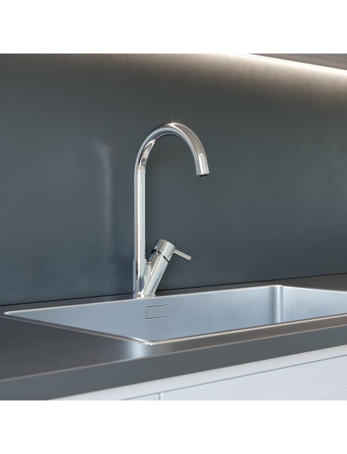 Смеситель для кухни Kitchen Line в современном дизайне подойдет практически к любому интерьеру. Благодаря высокому поворотному J-изливу будет удобен в использовании даже с неглубокой мойкой.• Плавный ход ручки и абсолютная точность регулировки температуры и напора воды — за счет керамического картриджа Softap. Угол открывания ручки – 90 градусов, на себя; может отличаться в зависимости от партии.