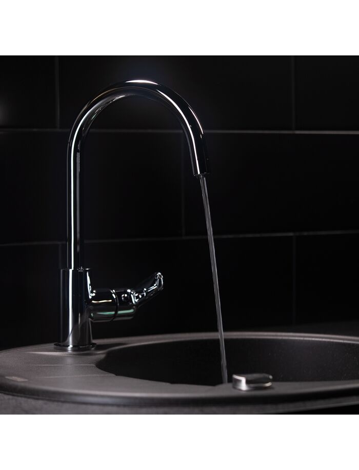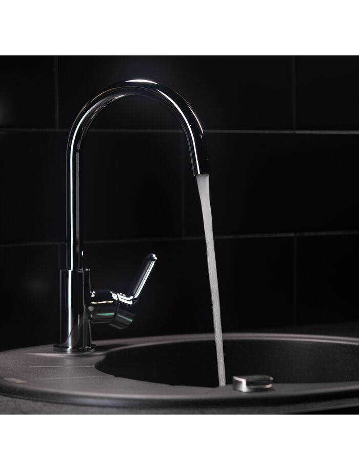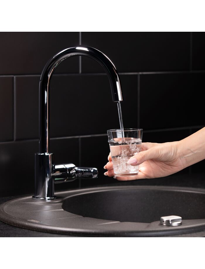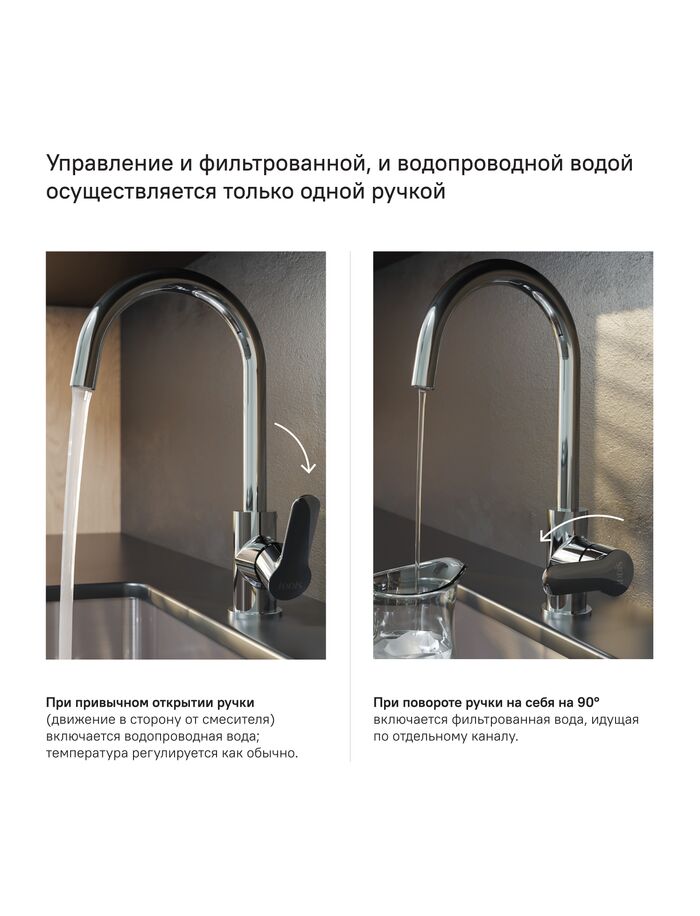 Смеситель для кухни Cuba с каналом для фильтрованной воды представляет уникальную технологию управления фильтрованной водой, которая практически не имеет аналогов: она включается той же ручкой, что и обычная. Чтобы налить стакан чистой воды, достаточно просто повернуть ручку на себя в закрытом состоянии. • Плавный ход ручки и абсолютная точность регулировки температуры и напора воды — за счет качественного керамического картриджа Softap. Угол открытия ручки для включения водопроводной воды – 90 градусов (45 градусов от себя, 45 – на себя).