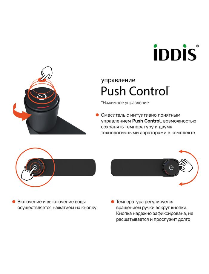 Смеситель для умывальника Slide с управлением Push Control в актуальном черном цвете — новый уровень удобства и стиля IDDIS®. Интуитивно понятное кнопочное управление Push Control — точная и невероятно простая настройка комфортной температуры воды. Включение-выключение воды осуществляется одним нажатием на кнопку, а температуру можно регулировать вращением ручки вокруг кнопки. При этом смеситель запоминает комфортную температуру воды: достаточно просто оставить ручку в выбранном положении — и больше не нужно настраивать воду при каждом включении смесителя. Смеситель также представлен в хроме.