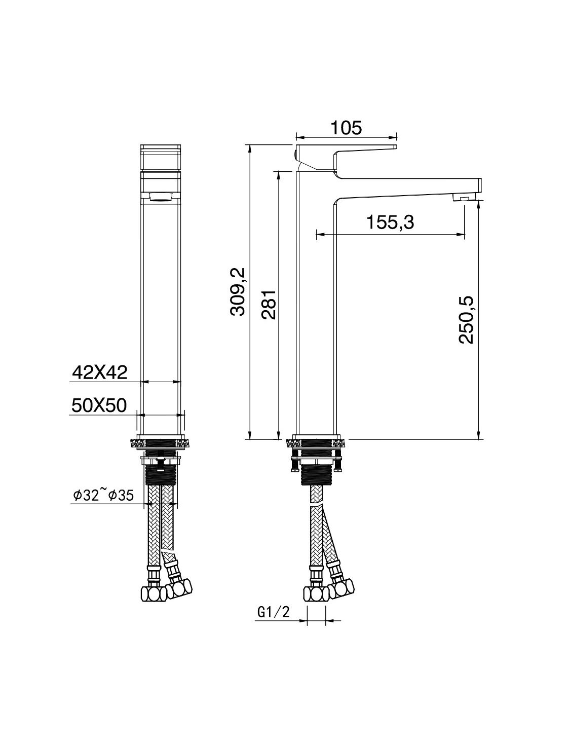 Смеситель для раковины высокий WONZON & WOGHAND CUBE 2.0, Темный графит (WW-88019068-BGM)