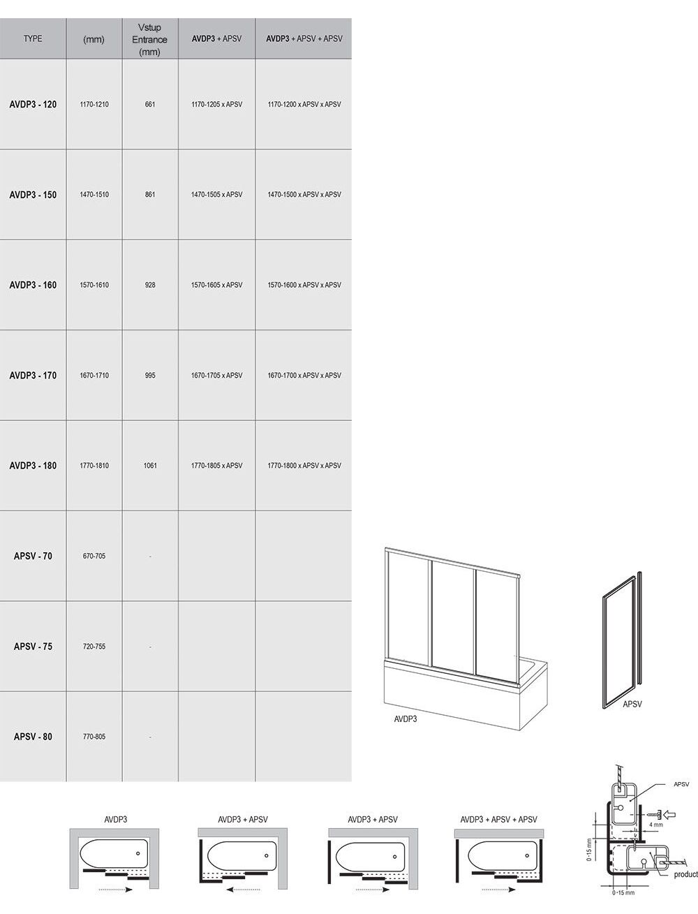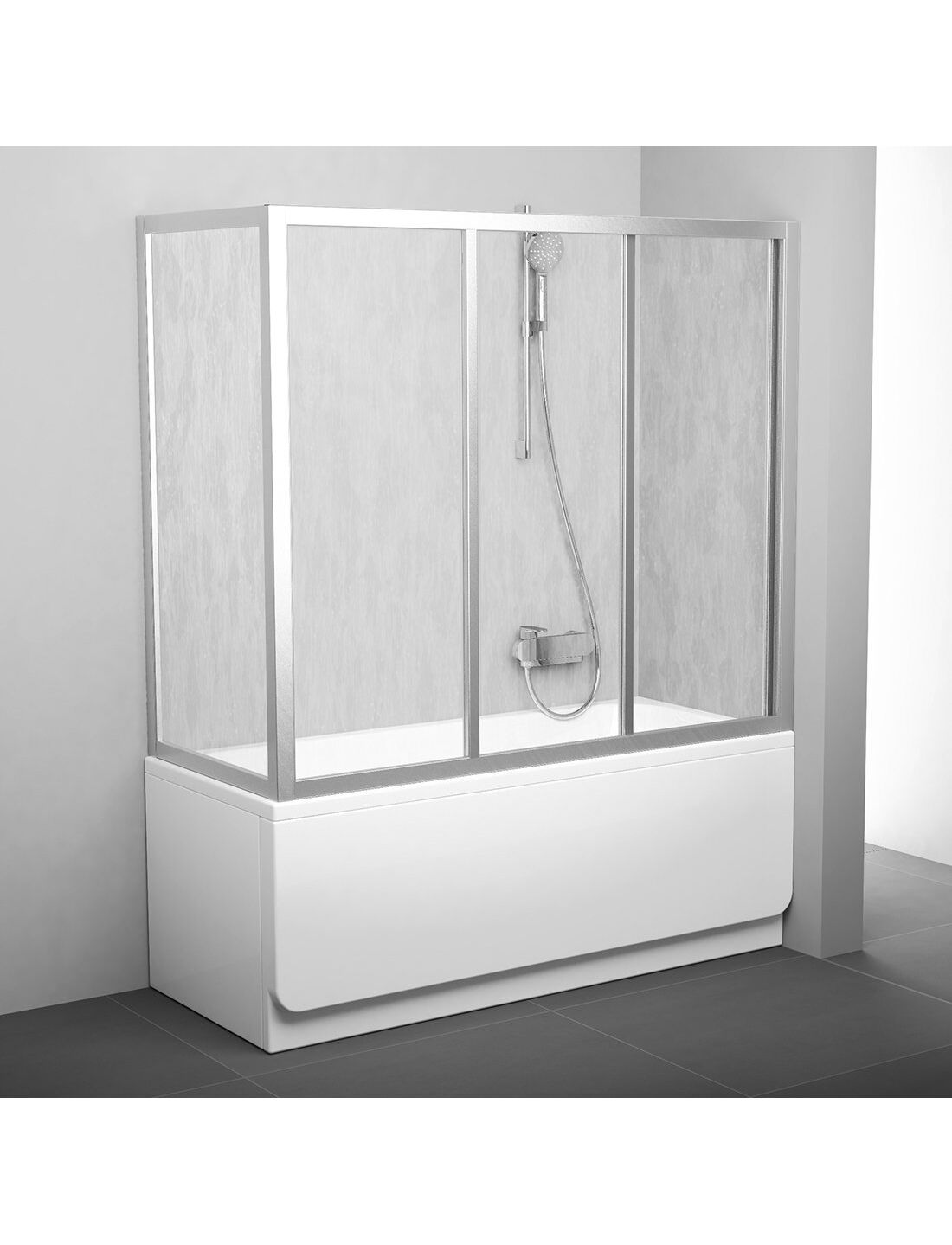 Неподвижная стенка состоит из одной неподвижной части. Конструкция составлена из толстостенных профилей с качественной поверхностной обработкой и максимальной герметичностью. Двери для ванны AVDP3 вместе с неподвижной стенкой APSV можно устанавливать на прямоугольные ванны (Classic, Sonata, Campanula II, Vanda II и Lilia) или на какую-либо классическую прямоугольную ванну с ровным передним бортом. Стандартная высота стенки 1370 мм. Для соединения дверей с неподвижной стенкой служит угловой профиль, которых входит в комплектацию неподвижной стенки. Регулирующий профиль ANPV позволяет расширить изделие на 20 мм. Возможно изготовление нестандартных размеров.