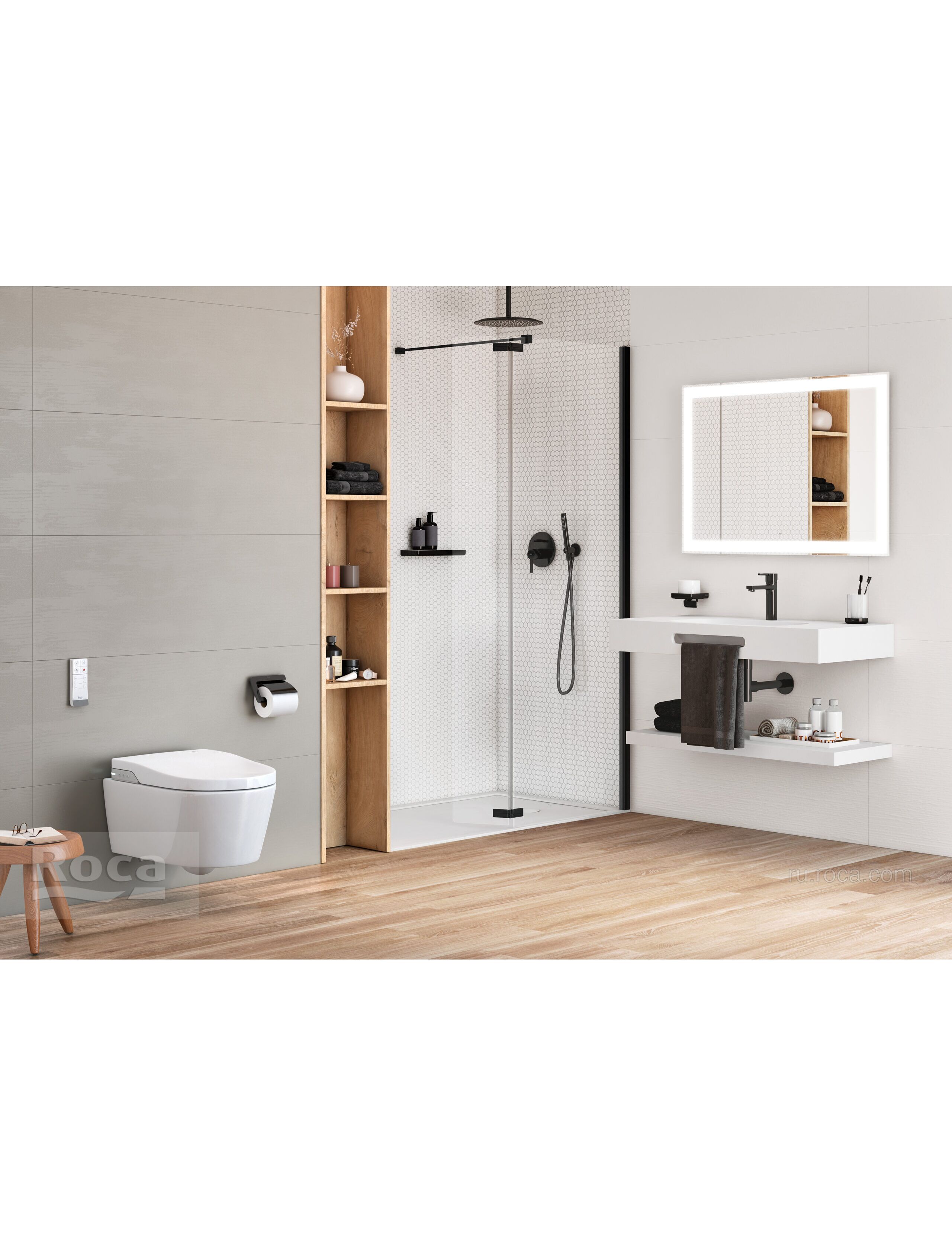 Подвесной унитаз-биде Roca Inspira In-Wash In-Tank:Выдвижной душ для интимной гигиены спереди и сзади;