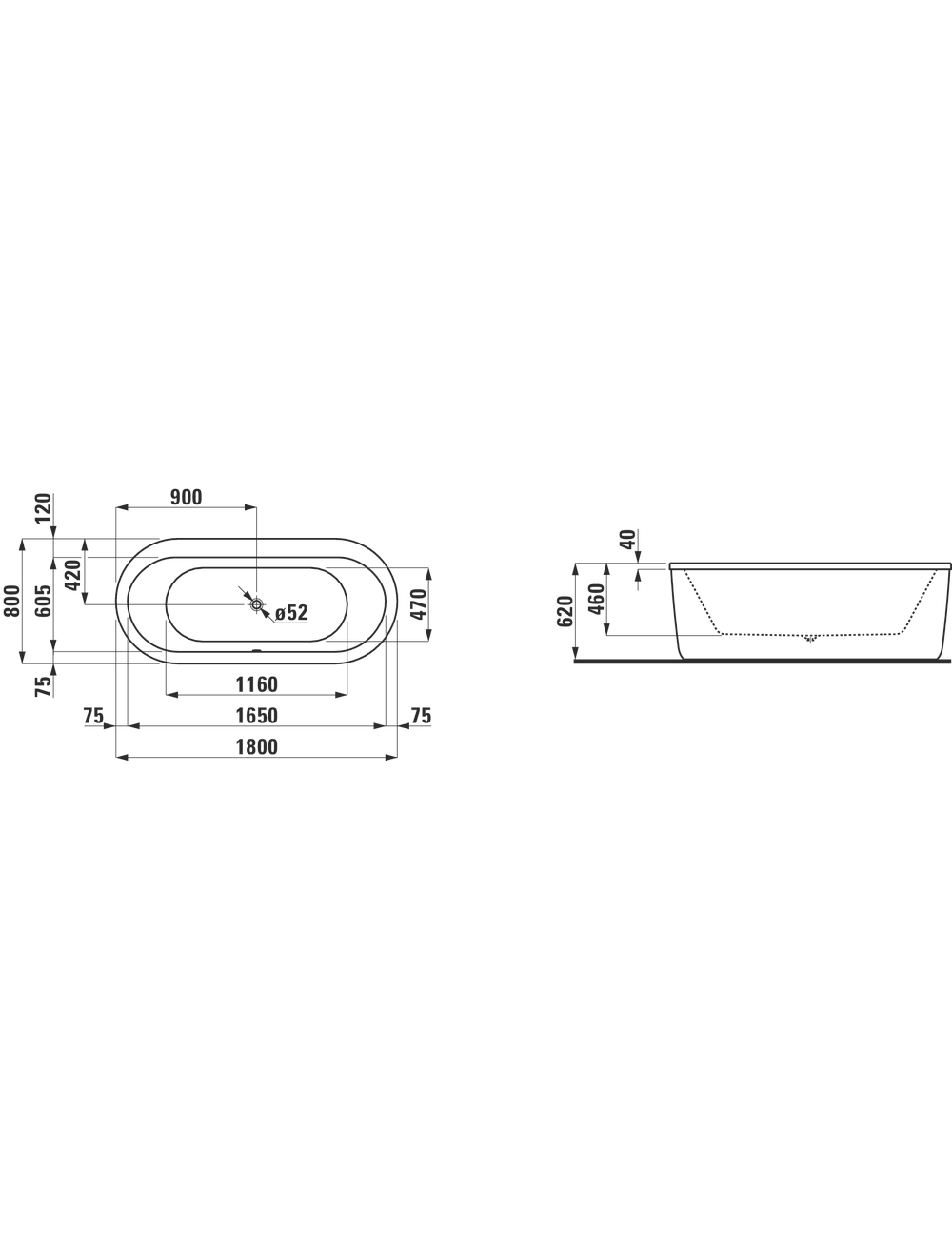 Овальная акриловая ванна Solutions 180x80 см, отверстие выпуска посередине, встраиваемая