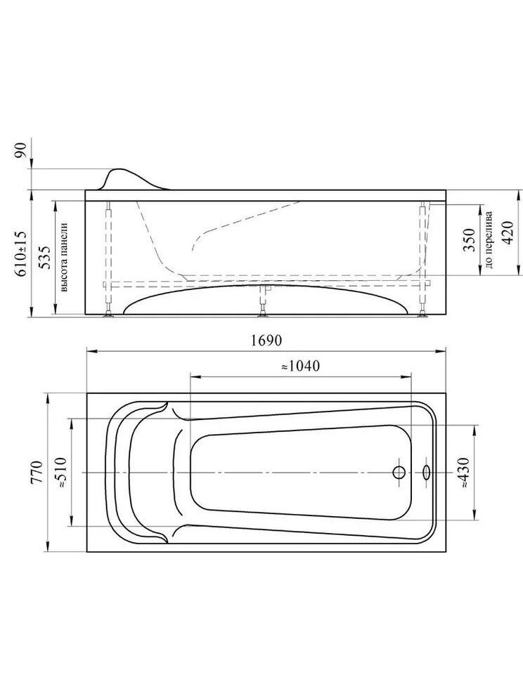Акриловая ванна Роза 169х77, фронтальная панель скандинавского вида, каркас (разборный)