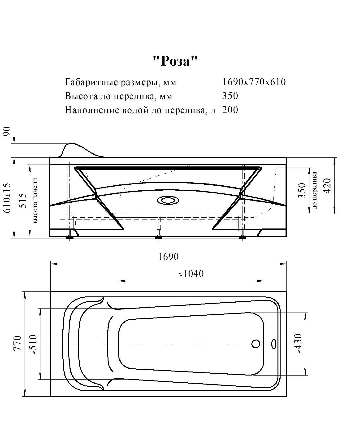 Акриловая ванна Роза 169х77, каркас (разборный)