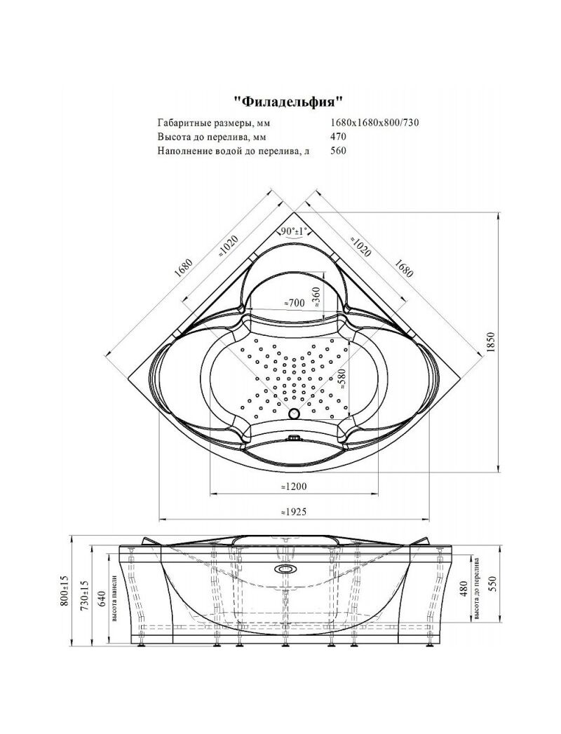 Ванна акриловая "ФИЛАДЕЛЬФИЯ", 1680х1680, рама-подставка, фронтальная панель, слив-перелив полуавтомат (бронза, с сифоном)