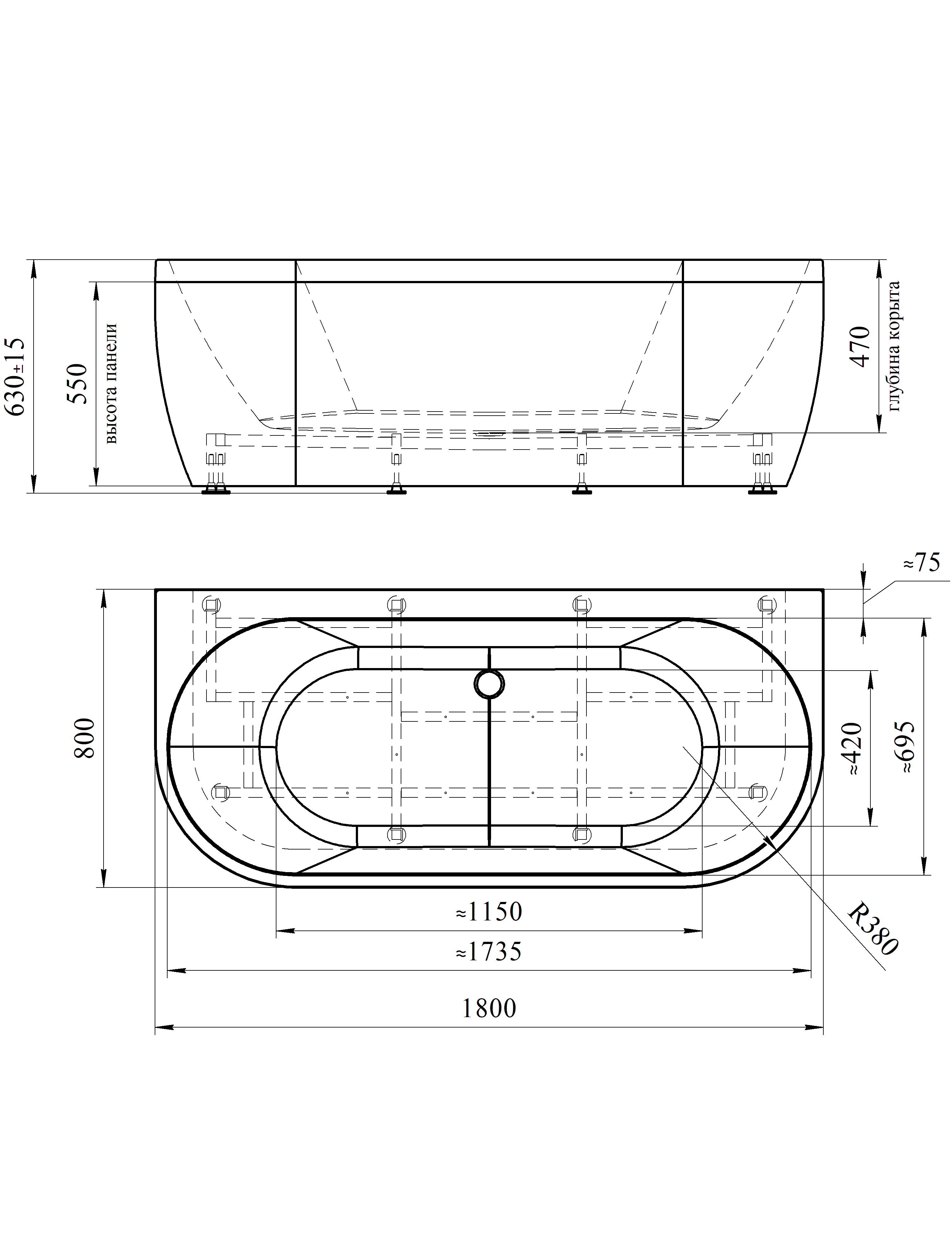 Ванна акриловая "ВАЛЬС МАКСИ 180х80", рама-подставка, фронтальная панель бесшовная, слив-перелив полуавтомат (хром, с сифоном)
