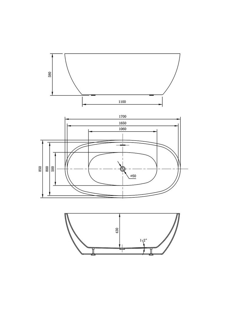Ванна акриловая Vincea VBT-404-1700, 1700*850*580, цвет белый, слив-перелив в комплекте, хром , , шт