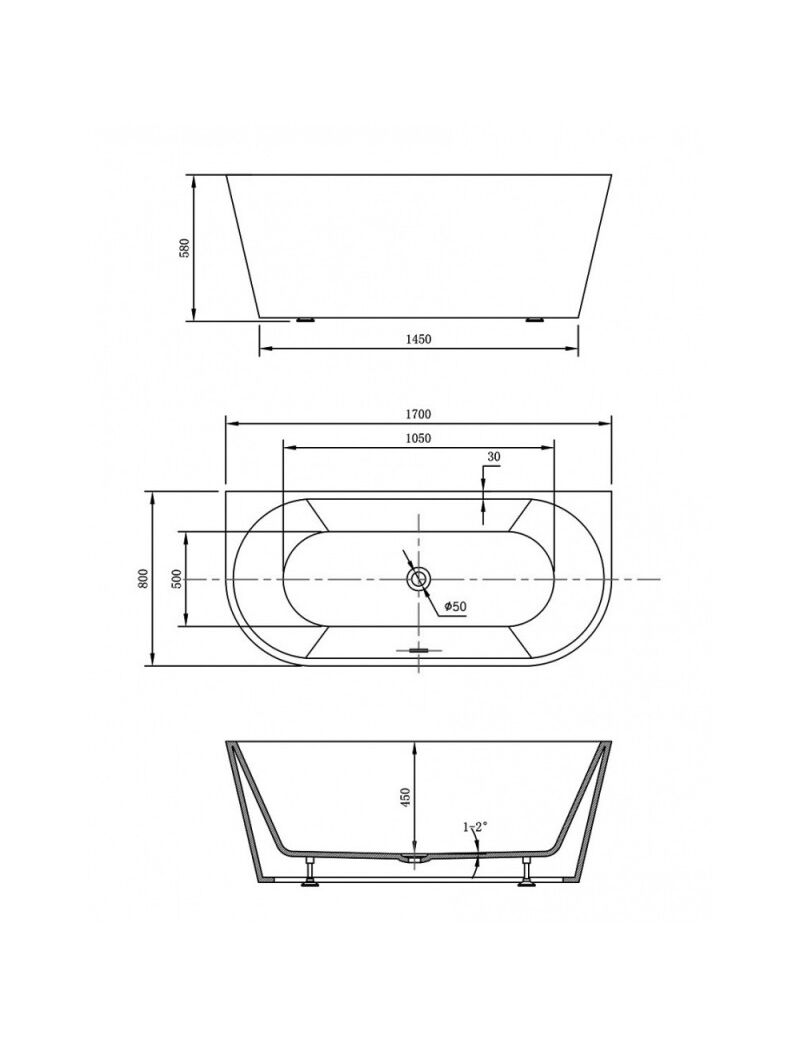 Ванна акриловая Vincea VBT-421-1700MW, 1700*800*580, цвет белый мат., щелевой перелив, слив белый, , шт