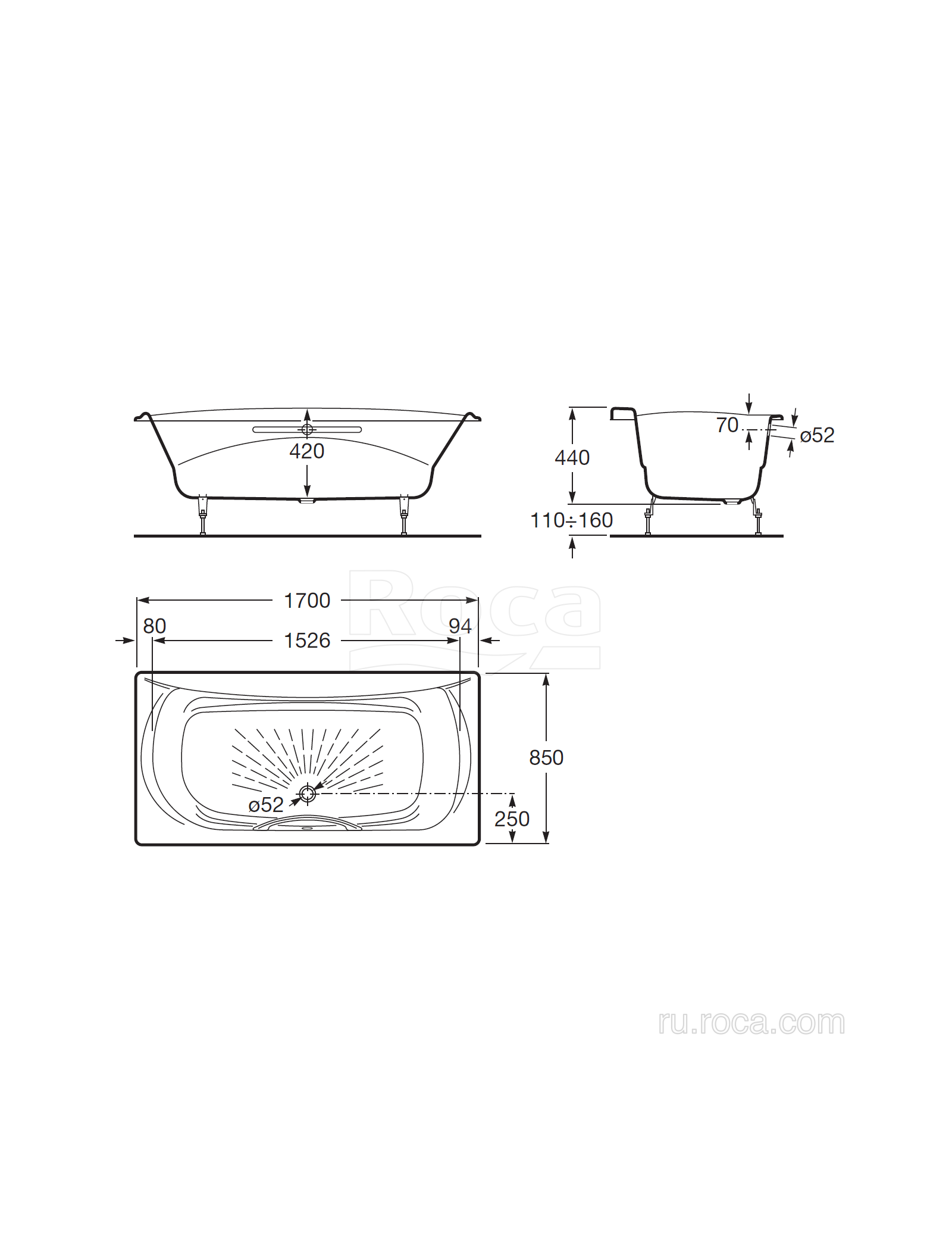 Ванна Roca Akira 170х85 с отверстиями для ручек, anti-slip 2325G000R