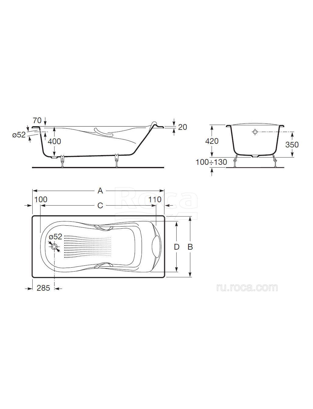 Ванна Roca Haiti 160x80 с отверстиями для ручек, anti-slip 2330G000R
