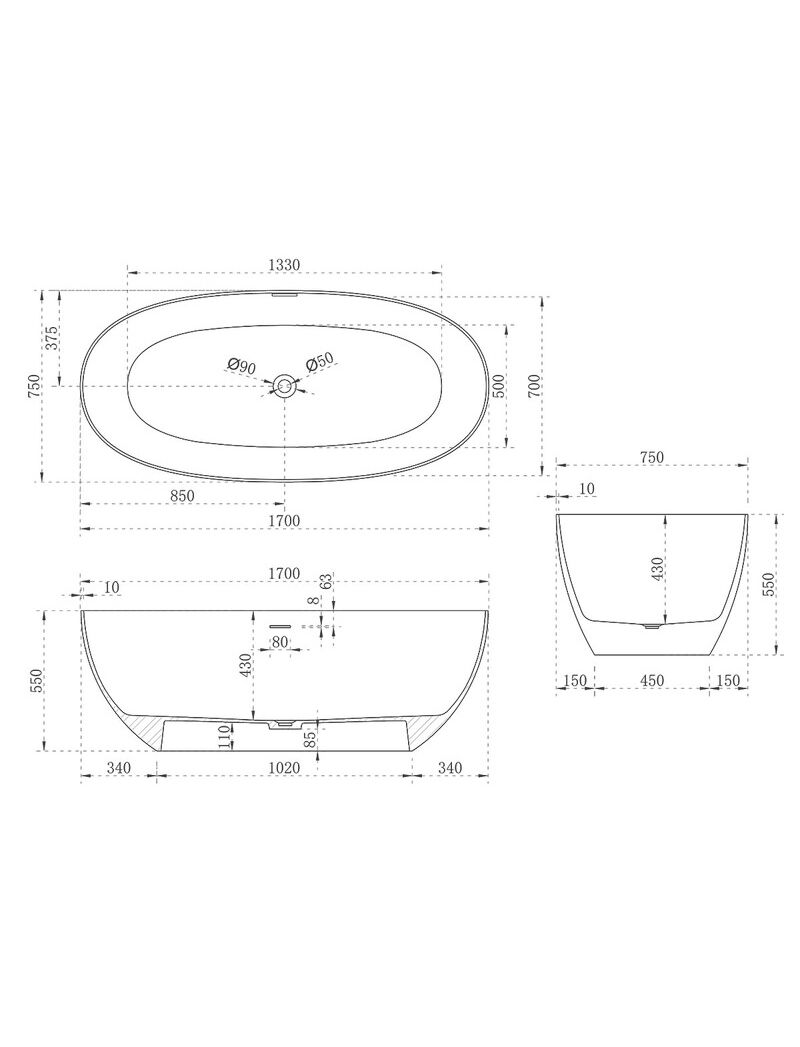 Ванна из искусственного камня Vincea VBT-6S01MG, 1700*750*550, серый/белый мат., слив-перелив , , шт