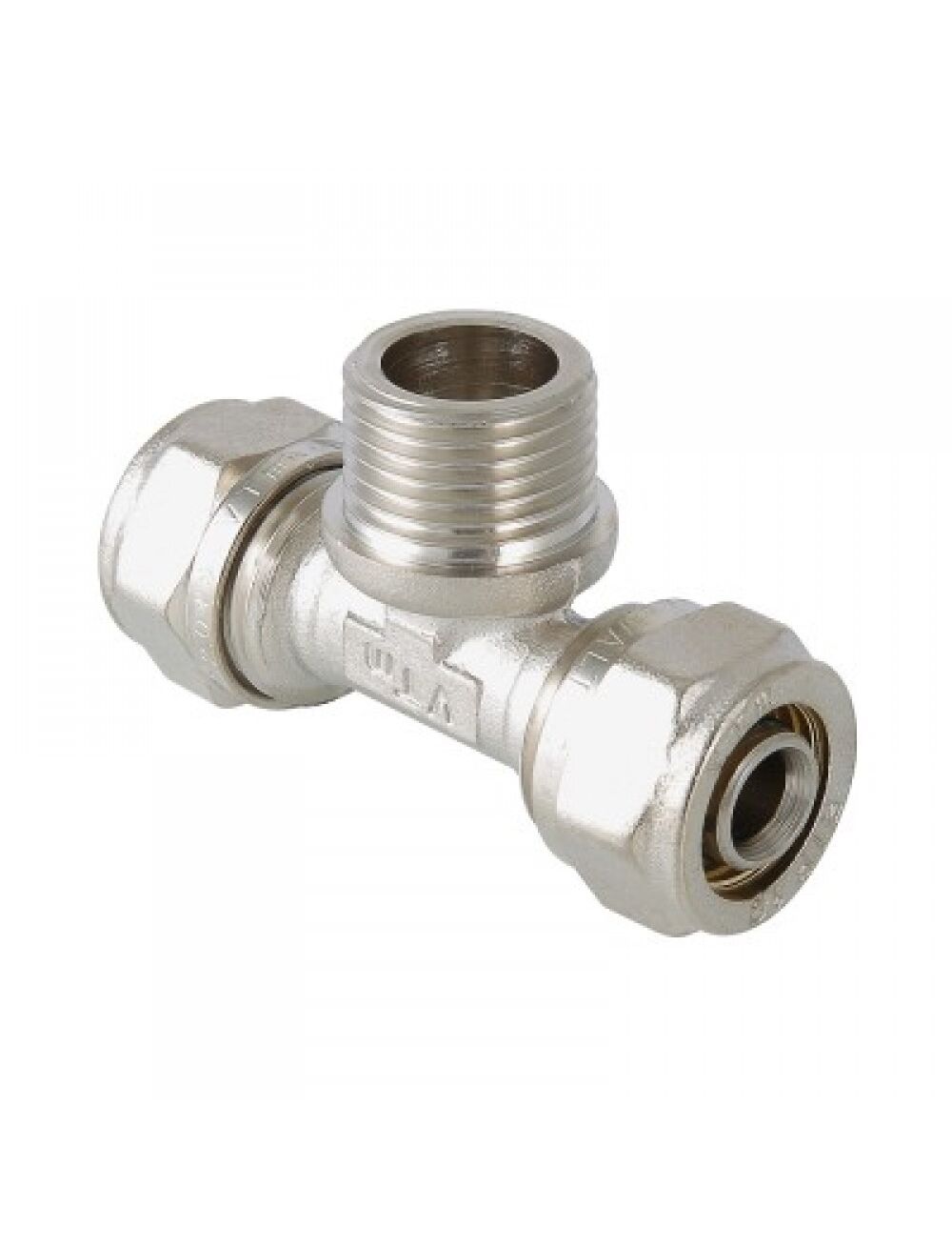 - Фитинг обжимной – тройник с переходом на наружную резьбу для присоединения металлополимерных (металлопластиковых) трубопроводов. Резьба фитинга – наружная трубная по ГОСТу 6357.