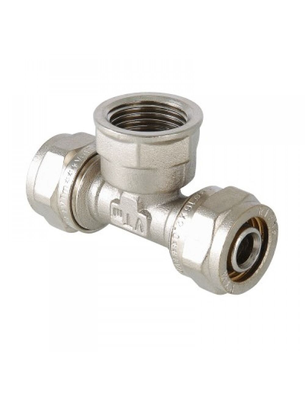 - Фитинг обжимной – тройник с переходом на внутреннюю резьбу для металлополимерных (металлопластиковых) труб. Резьба фитинга – внутренняя трубная по ГОСТу 6357..
