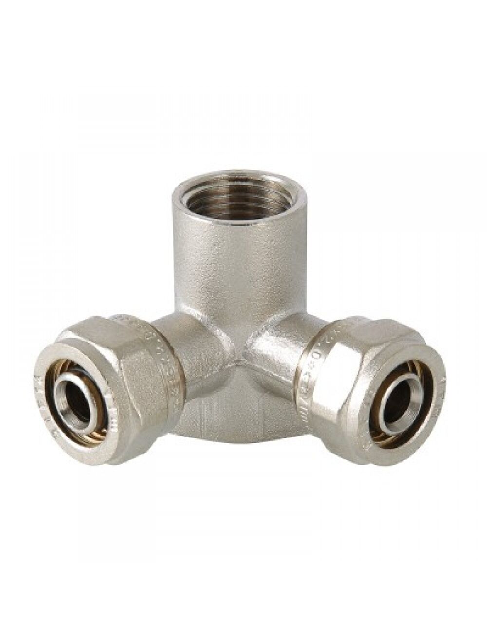 - Латунный никелированный угловой тройник с креплением (проходная водорозетка) для соединения металлопластиковой трубы с компонентом системы, имеющим резьбовое подключение. Резьба фитинга – внутренняя трубная по ГОСТу 6357.