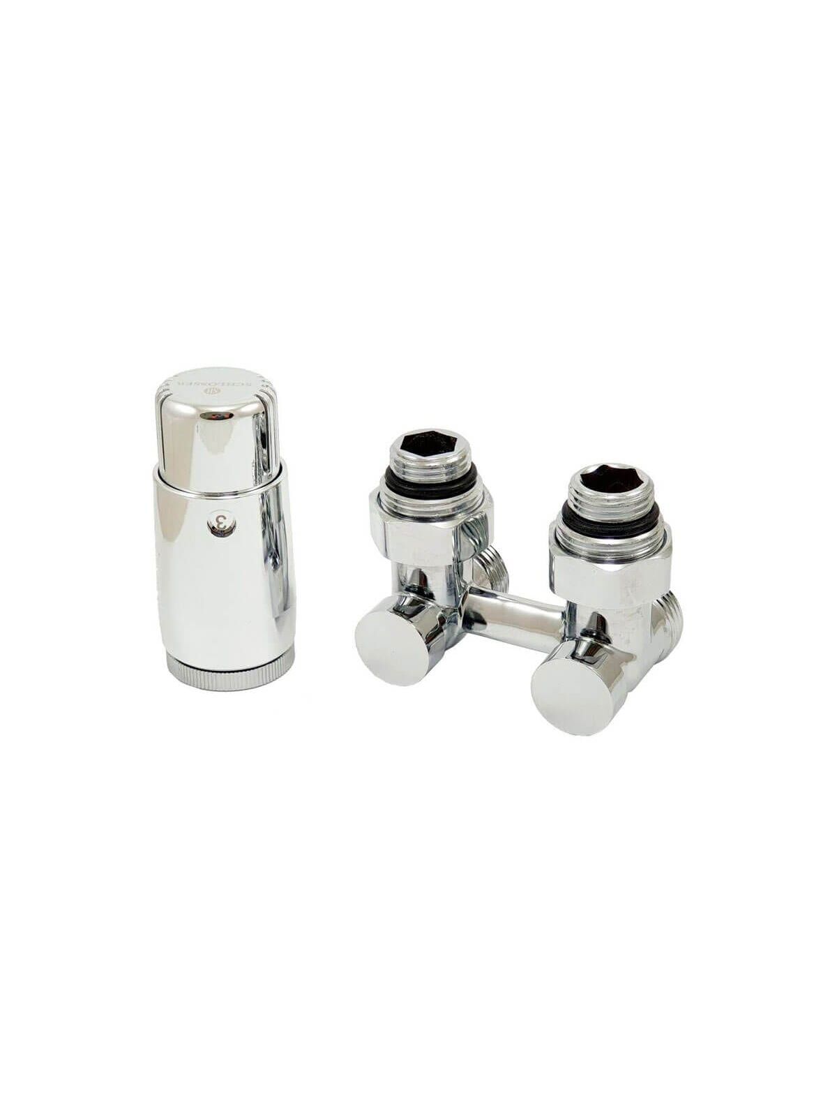 Комплект узел нижнего подключения угловой, хром G 3/4 x 3/4 D=50 мм с термоголовкой MINI M30x1,5 + 2 Ниппеля 1/2x3/4