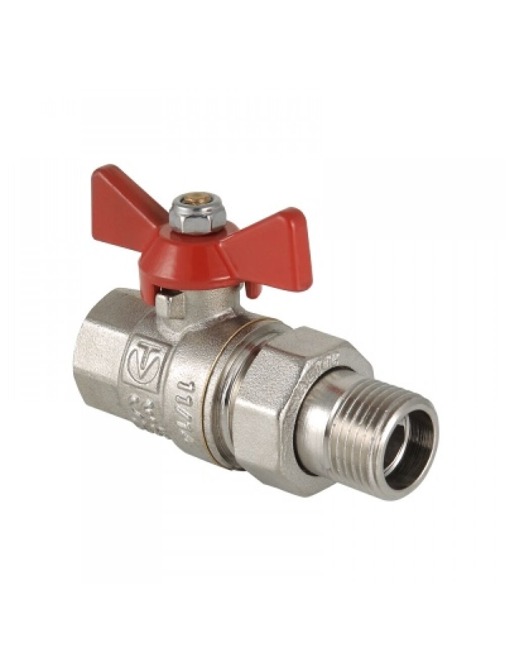- Прямой полнопроходной ремонтопригодный шаровой кран с увеличенным ресурсом. Соединен накидной гайкой с резьбовым полусгоном. Корпуса деталей – латунные, никелированные. Кран оснащен ручкой типа «бабочка» с утолщенной стенкой из алюминиевого сплава и эпоксидной покраской. Резьба присоединений – внутренняя/наружная.