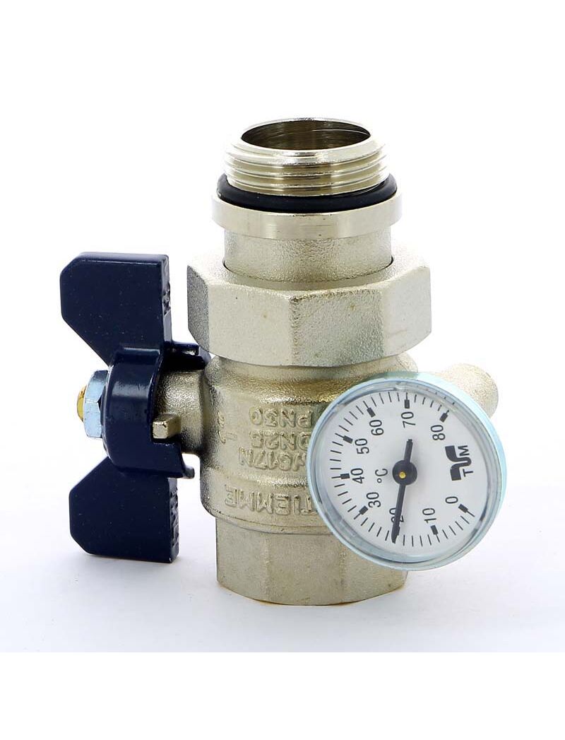 Кран 1 1/4" шаровый со сгоном и термометром (синяя бабочка)