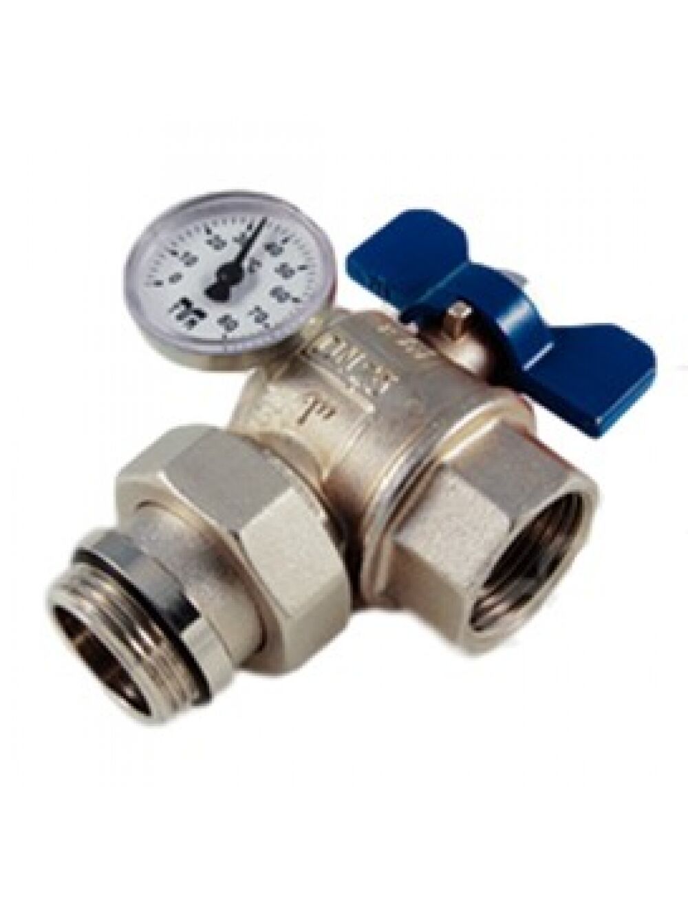 Кран угловой 1" шаровый со сгоном и термометром (син. бабочка)